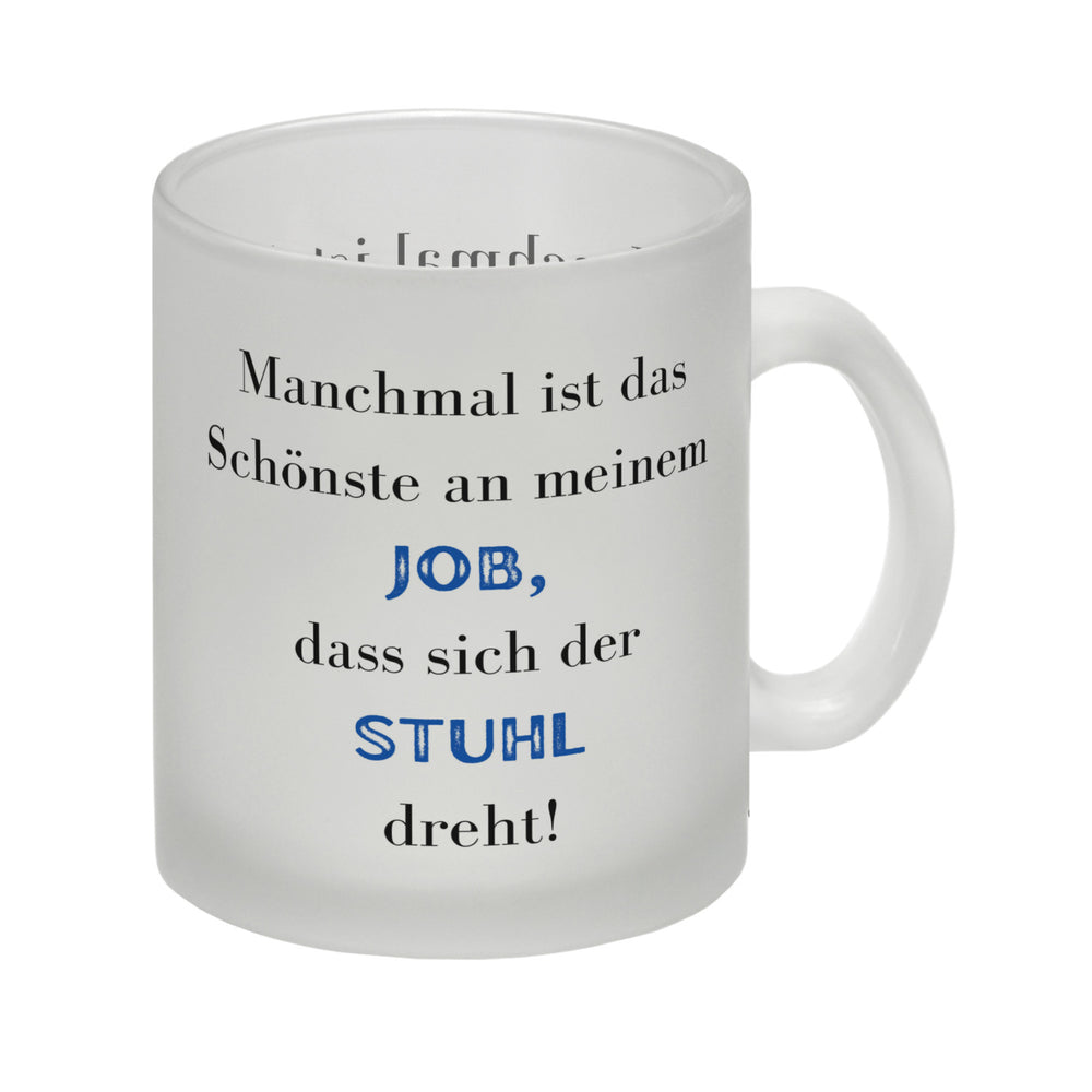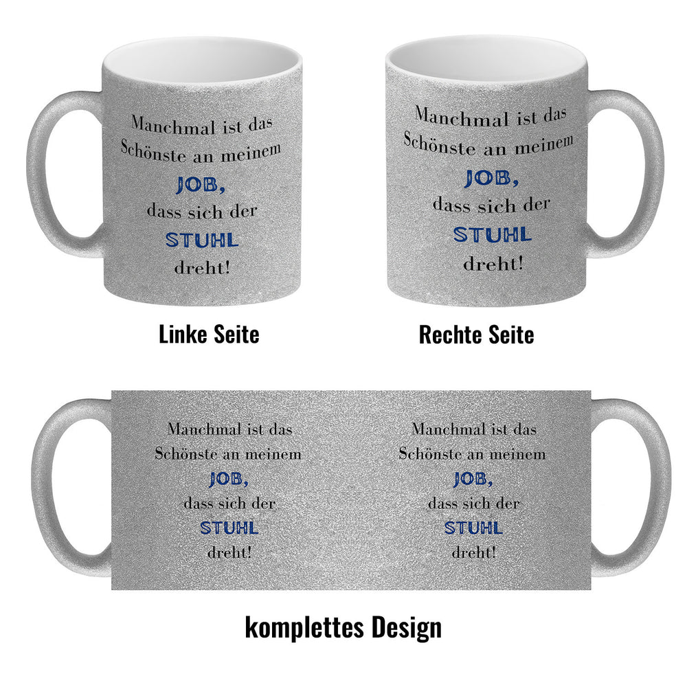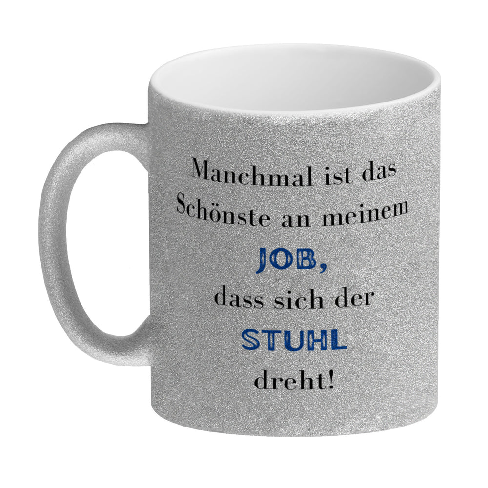 Dieser Highlight meines Jobs Kaffeebecher ist der perfekte Begleiter für jeden Bürohengst. Mit seinem witzigen Job-Motiv und dem Spruch Manchmal ist das Schönste an meinem Job, dass sich der Stuhl dreht! bringt er jeden Schreibtisch zum Lachen. Der Becher hat ein Fassungsvermögen von 300ml - genug Platz für Kaffee, Tee oder heiße Schokolade. Er ist spülmaschinenfest und in verschiedenen Varianten erhältlich: Als weiße Standardtasse, mit farbigem Henkel und Innenseite, als edle Glastasse oder in der exklusiven Silberedition mit Glitzereffekt. Mit Sorgfalt bedruckt in unserer Tassen-Manufaktur in Deutschland. Dieser witzige Kaffeebecher ist nicht nur ein praktisches Utensil für den täglichen Kaffeegenuss, sondern auch ein echter Hingucker am Arbeitsplatz. Schenken Sie ihn als Geschenk zu besonderen Anlässen wie Geburtstag oder Wiegenfest oder überraschen Sie Ihren Kollegen damit. Mit diesem Produkt verleihen Sie Ihrem Arbeitsalltag etwas Humor und Lebensfreude. Ein Muss für jeden Bürohengst! Überzeugen Sie sich selbst und probieren Sie es aus!