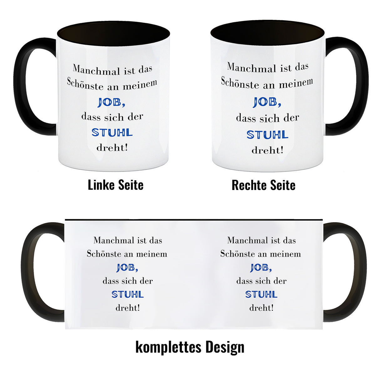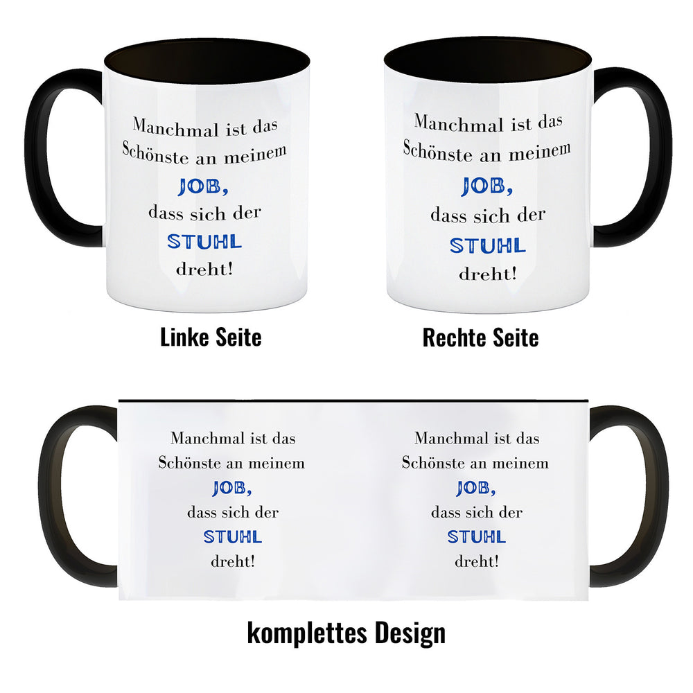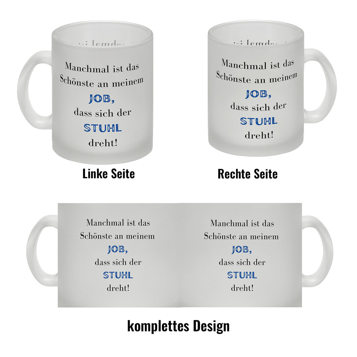 Dieser Highlight meines Jobs Kaffeebecher ist der perfekte Begleiter für jeden Bürohengst. Mit seinem witzigen Job-Motiv und dem Spruch Manchmal ist das Schönste an meinem Job, dass sich der Stuhl dreht! bringt er jeden Schreibtisch zum Lachen. Der Becher hat ein Fassungsvermögen von 300ml - genug Platz für Kaffee, Tee oder heiße Schokolade. Er ist spülmaschinenfest und in verschiedenen Varianten erhältlich: Als weiße Standardtasse, mit farbigem Henkel und Innenseite, als edle Glastasse oder in der exklusiven Silberedition mit Glitzereffekt. Mit Sorgfalt bedruckt in unserer Tassen-Manufaktur in Deutschland. Dieser witzige Kaffeebecher ist nicht nur ein praktisches Utensil für den täglichen Kaffeegenuss, sondern auch ein echter Hingucker am Arbeitsplatz. Schenken Sie ihn als Geschenk zu besonderen Anlässen wie Geburtstag oder Wiegenfest oder überraschen Sie Ihren Kollegen damit. Mit diesem Produkt verleihen Sie Ihrem Arbeitsalltag etwas Humor und Lebensfreude. Ein Muss für jeden Bürohengst! Überzeugen Sie sich selbst und probieren Sie es aus!