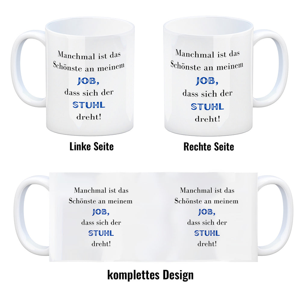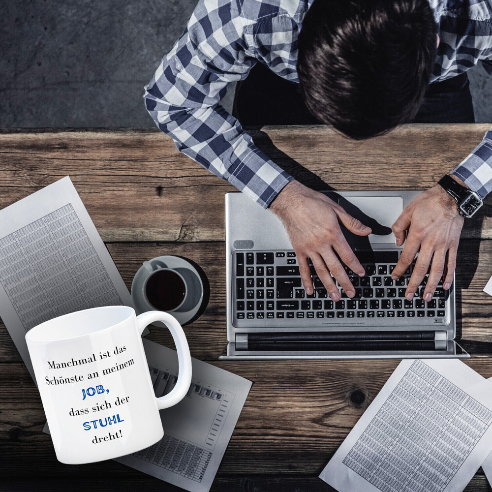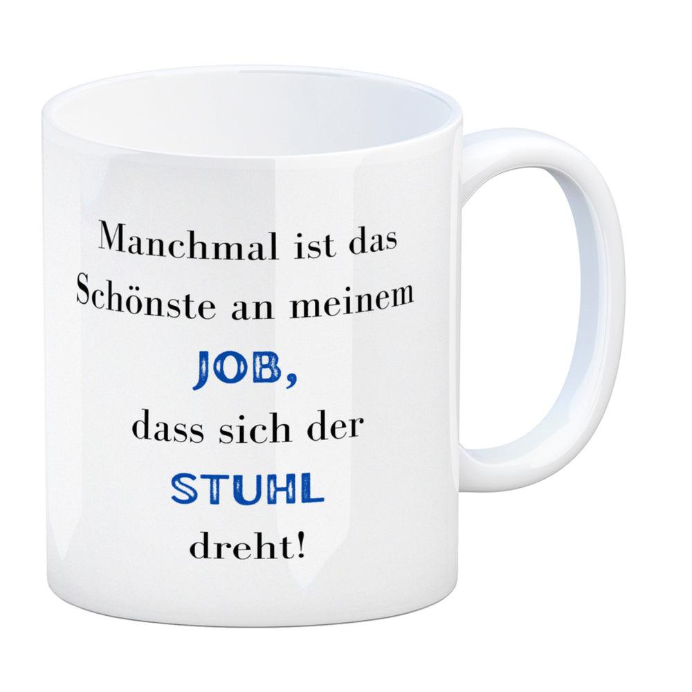 • Unser Kaffeebecher ist der perfekte Begleiter für jeden Bürohengst. Mit seinem witzigen Job-Motiv und dem Spruch "Manchmal ist das Schönste an meinem Job, dass sich der Stuhl dreht!" Bringt er jeden Schreibtisch zum Lachen. Der Becher hat ein Fassungsvermögen von 300ml - genug Platz für Kaffee, Tee oder heiße Schokolade.
