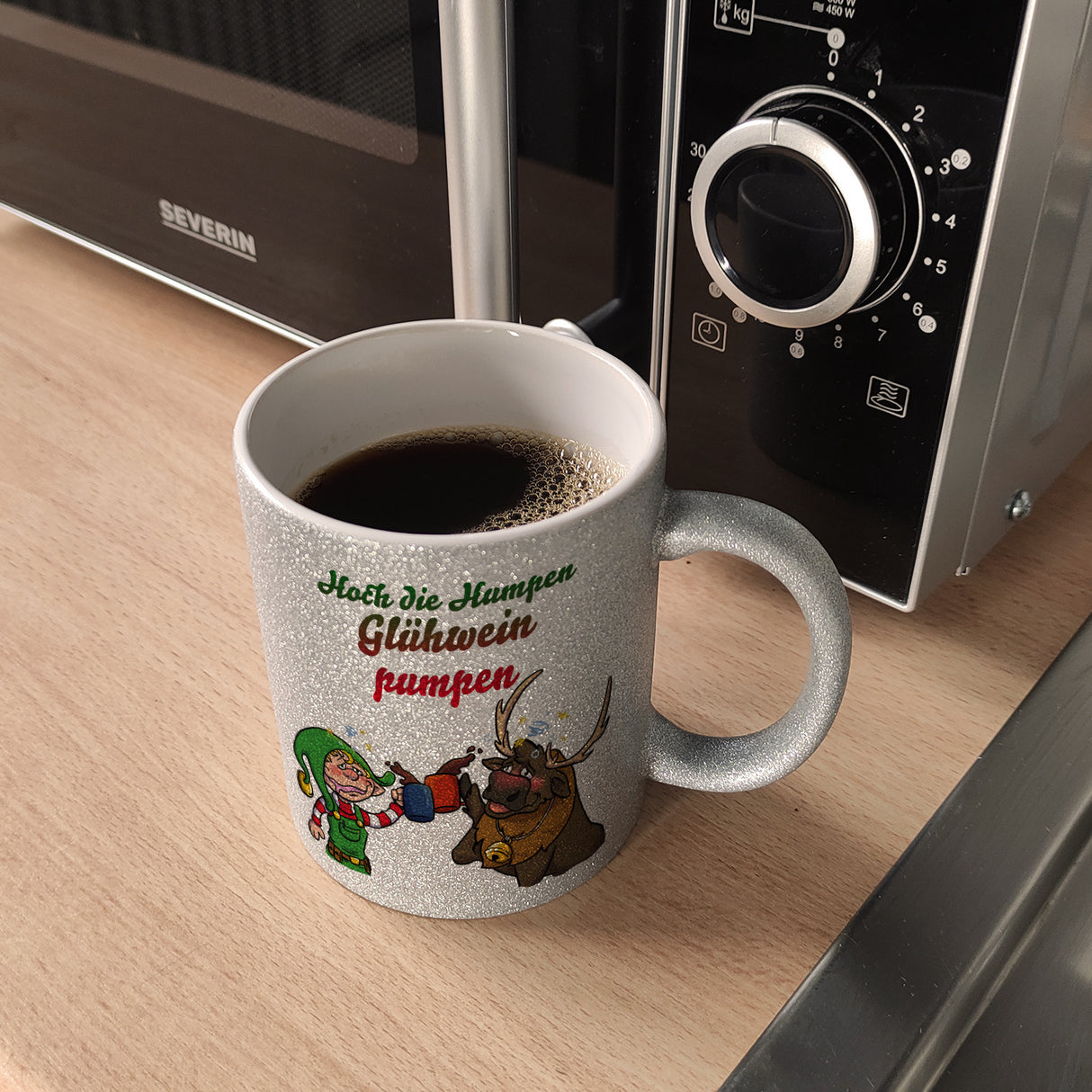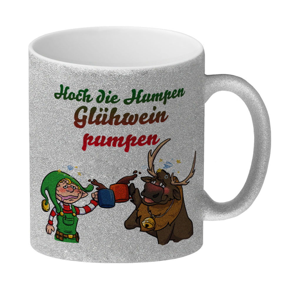 - Die Weihnachtszeit ist die Zeit der Weihnachtsmärkte und damit auch Zeit für Glühwein. Dies ist ein schöner Anlass, sich mal wieder mit Freunden zu treffen, um einen schönen warmen Glühwein bei der Winterkälte zu trinken. Dabei hebt eine lustige Tasse mit dem auffordernden Spruch 'Hoch die Humpen Glühwein pumpen' die Stimmung.