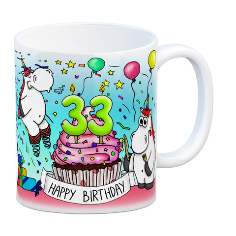 Honeycorns Tasse zum 33. Geburtstag mit Muffin und Einhorn Party