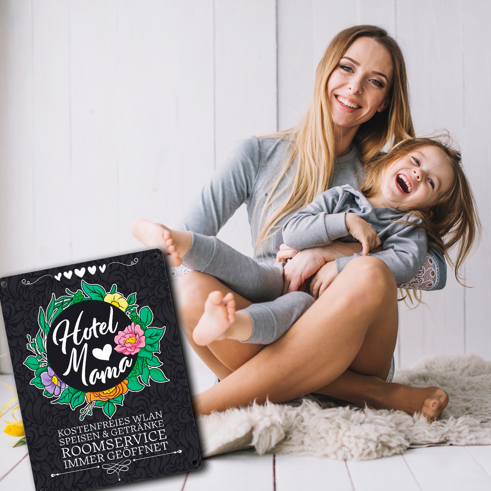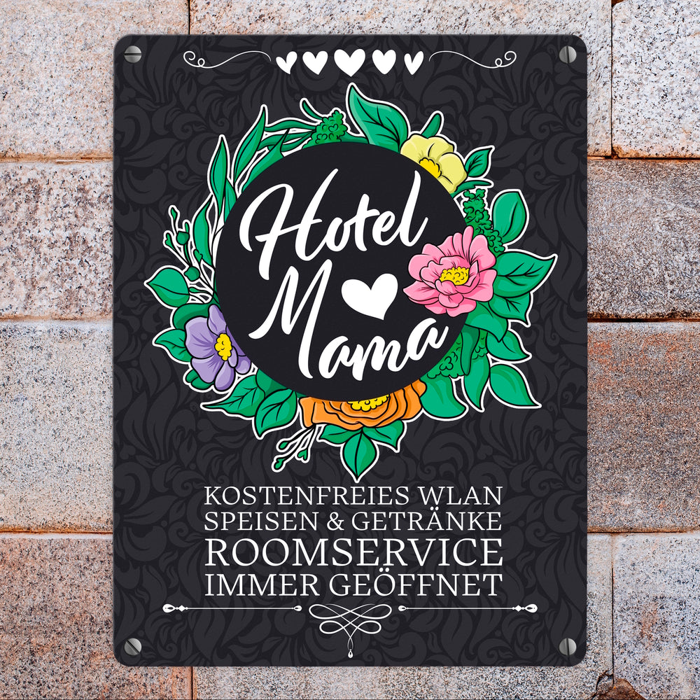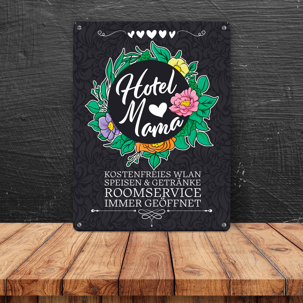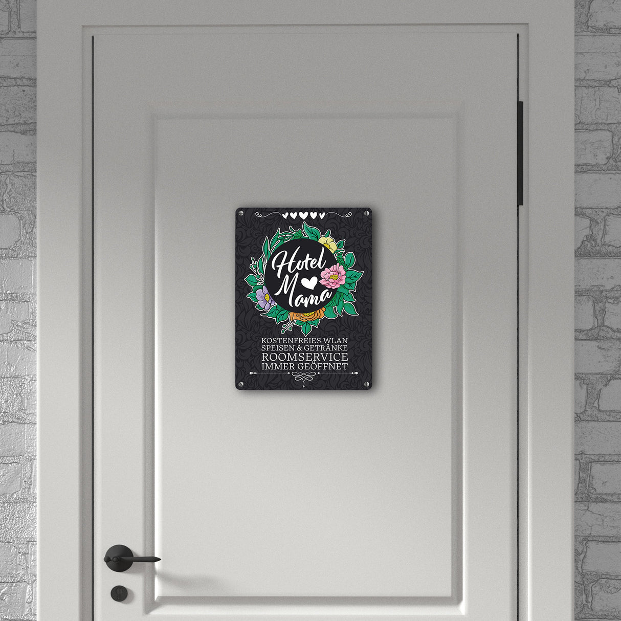 - 1x Hotel Mama Metallschild mit floralen Mustern und Aufschriften in der gewählten Größe