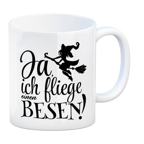 Kaffeebecher mit witzigem Hexenmotiv zu Halloween - Ja, ich fliege einen Besen