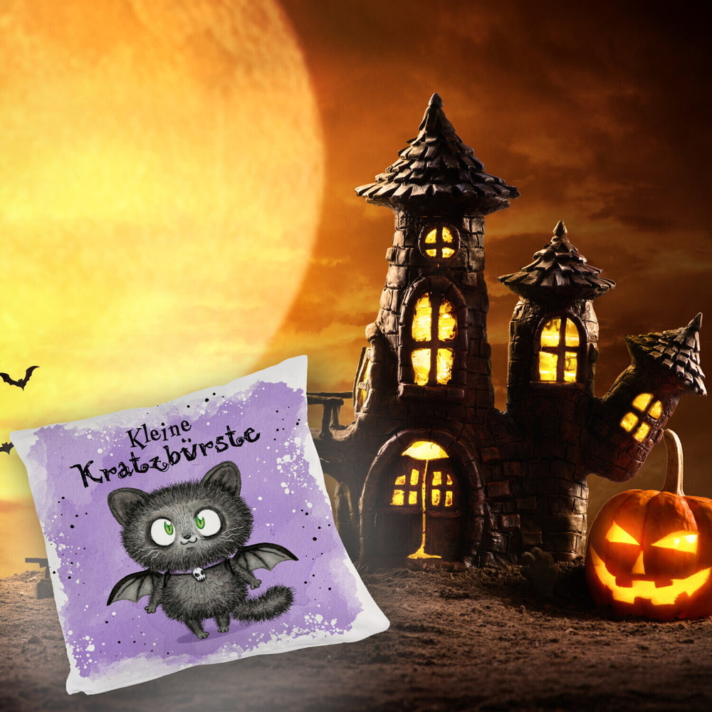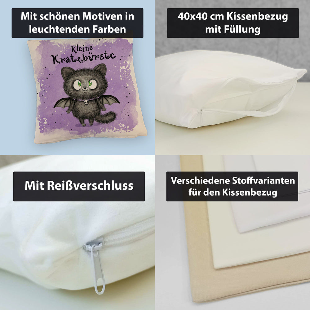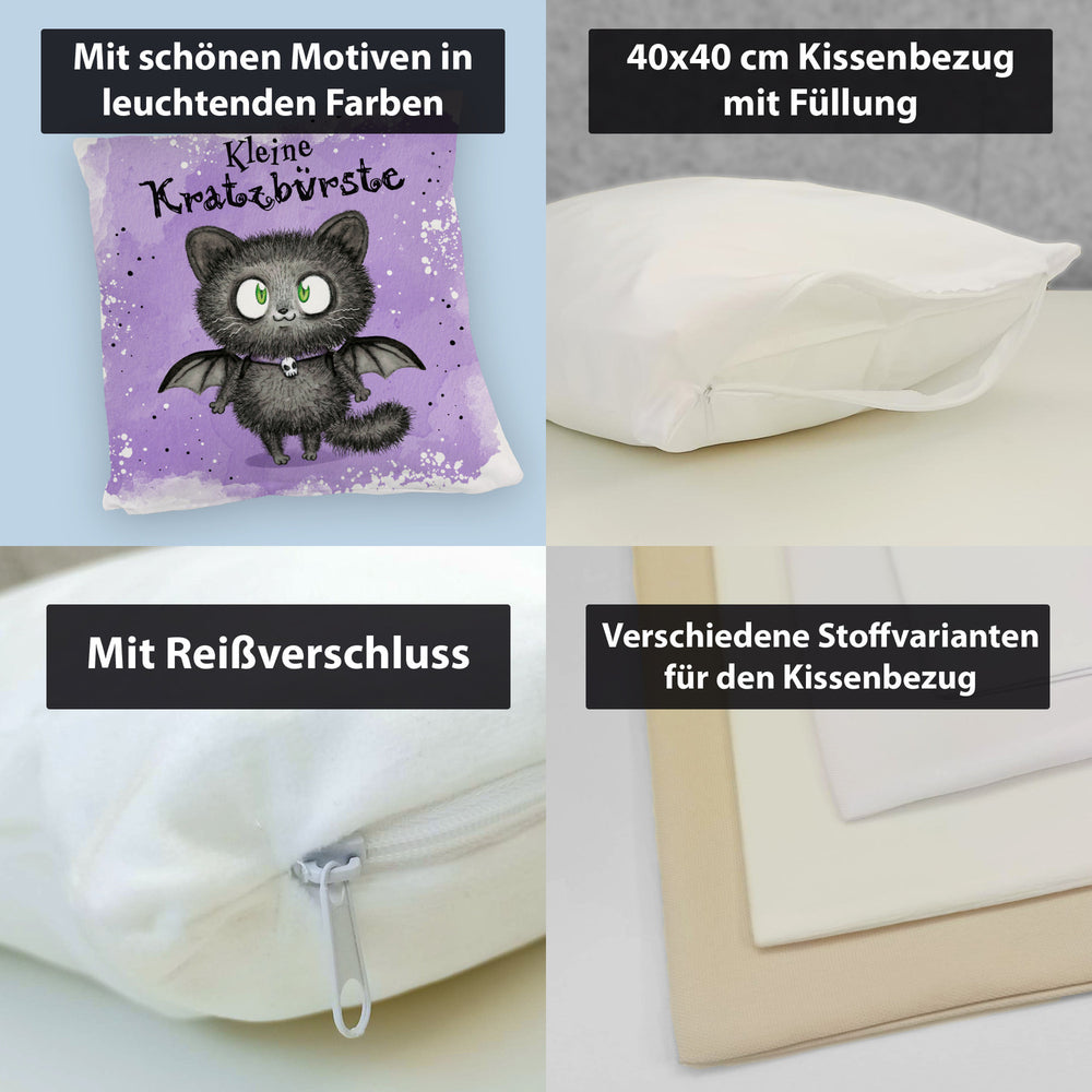 - Das niedliche Kissen mit dem frechen, flauschigen und süßen Motiv einer schwarzen Katze im Fledermauskostüm ist ein absoluter Hingucker! Es ist ideal für jeden, der sein Sofa oder Bett mit einem dekorativen und kuscheligen Accessoire aufpeppen möchte. Das Kissen ist in vier verschiedenen Oberflächen erhältlich, von kuschelig bis satiniert.