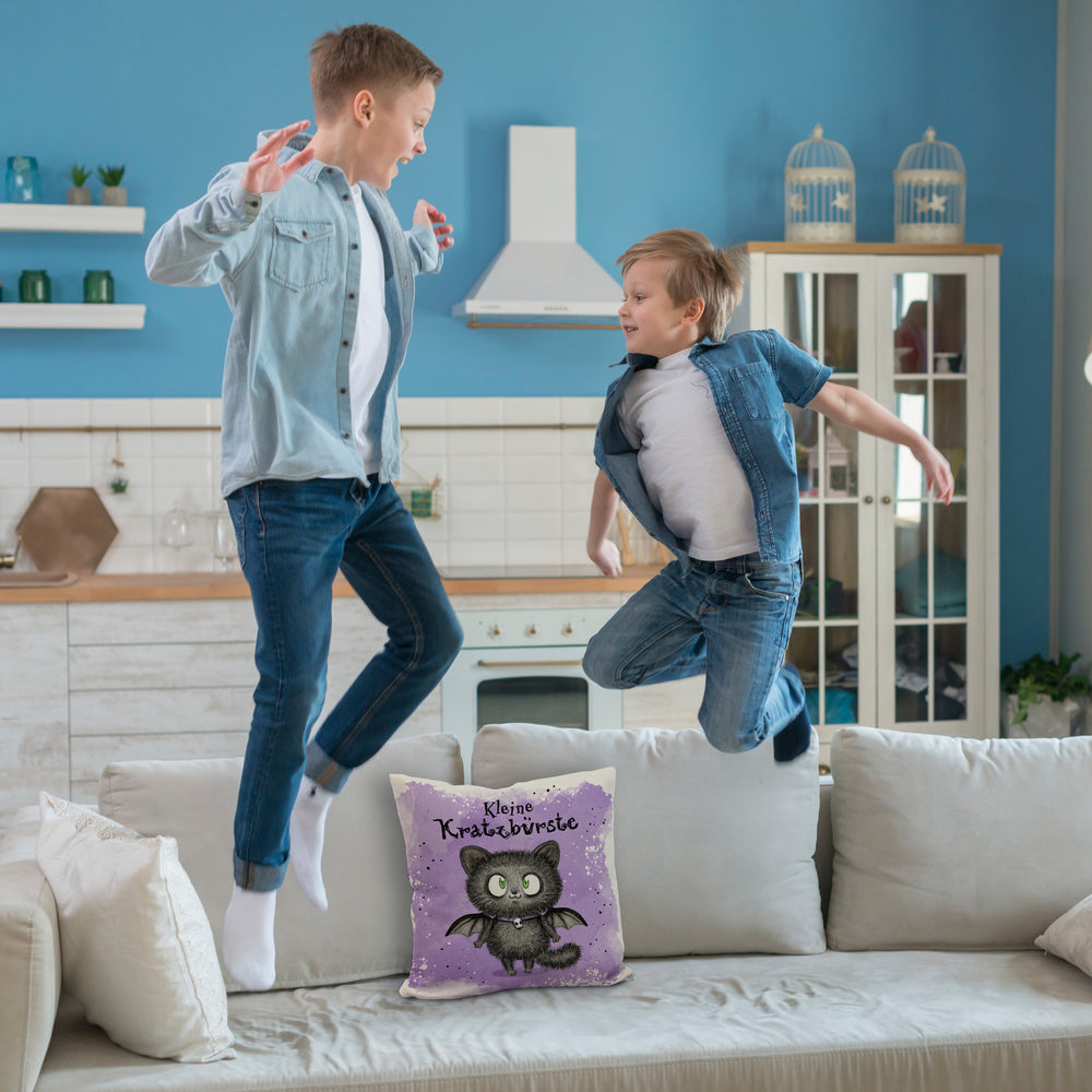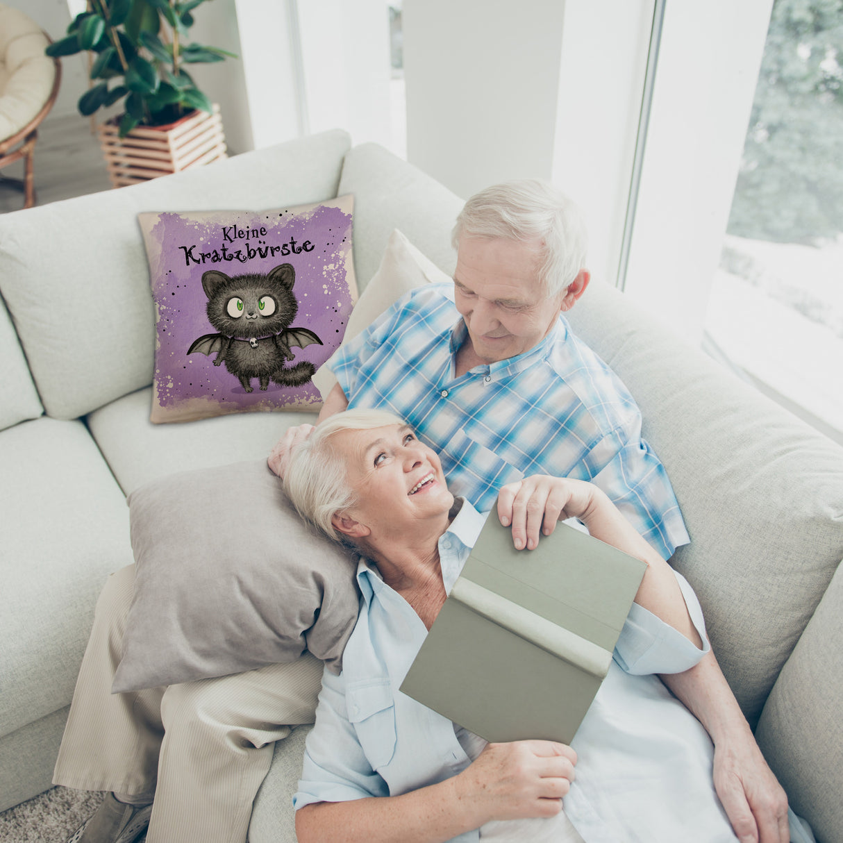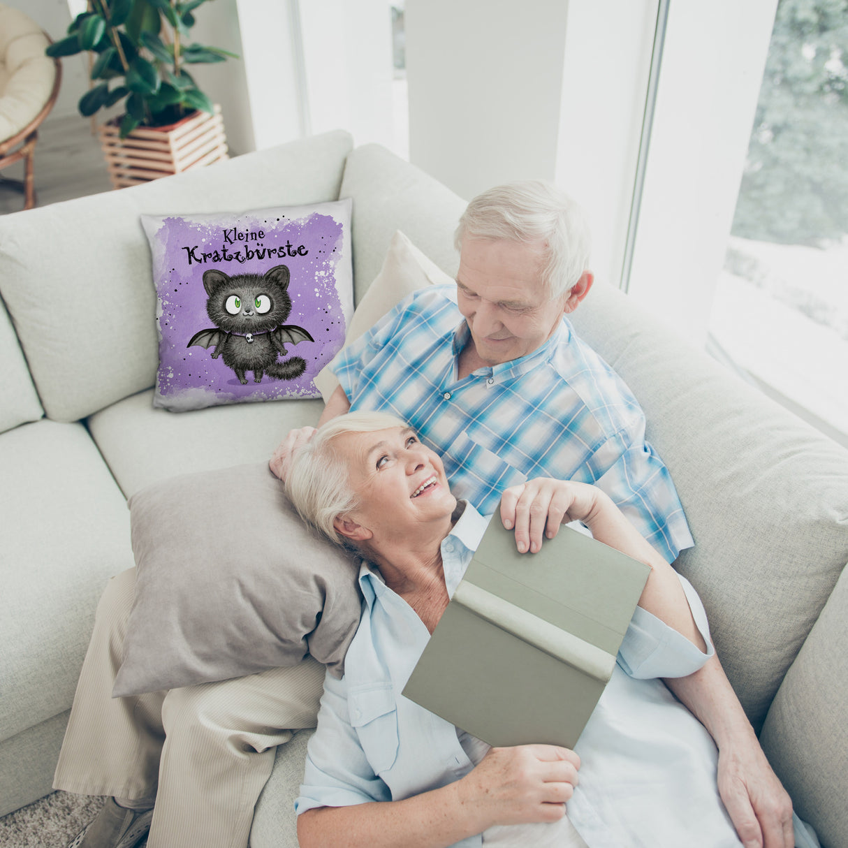 - Das niedliche Kissen mit dem frechen, flauschigen und süßen Motiv einer schwarzen Katze im Fledermauskostüm ist ein absoluter Hingucker! Es ist ideal für jeden, der sein Sofa oder Bett mit einem dekorativen und kuscheligen Accessoire aufpeppen möchte. Das Kissen ist in vier verschiedenen Oberflächen erhältlich, von kuschelig bis satiniert.