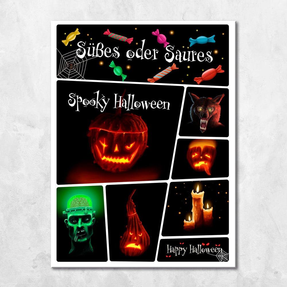 Süßes oder Saures Halloween Magnet mit Kürbis und Süßigkeiten