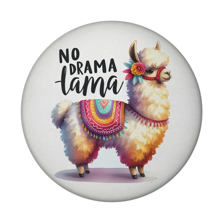 Alpaka mit bunter Satteldecke Magnet rund mit Spruch No Drama Lama