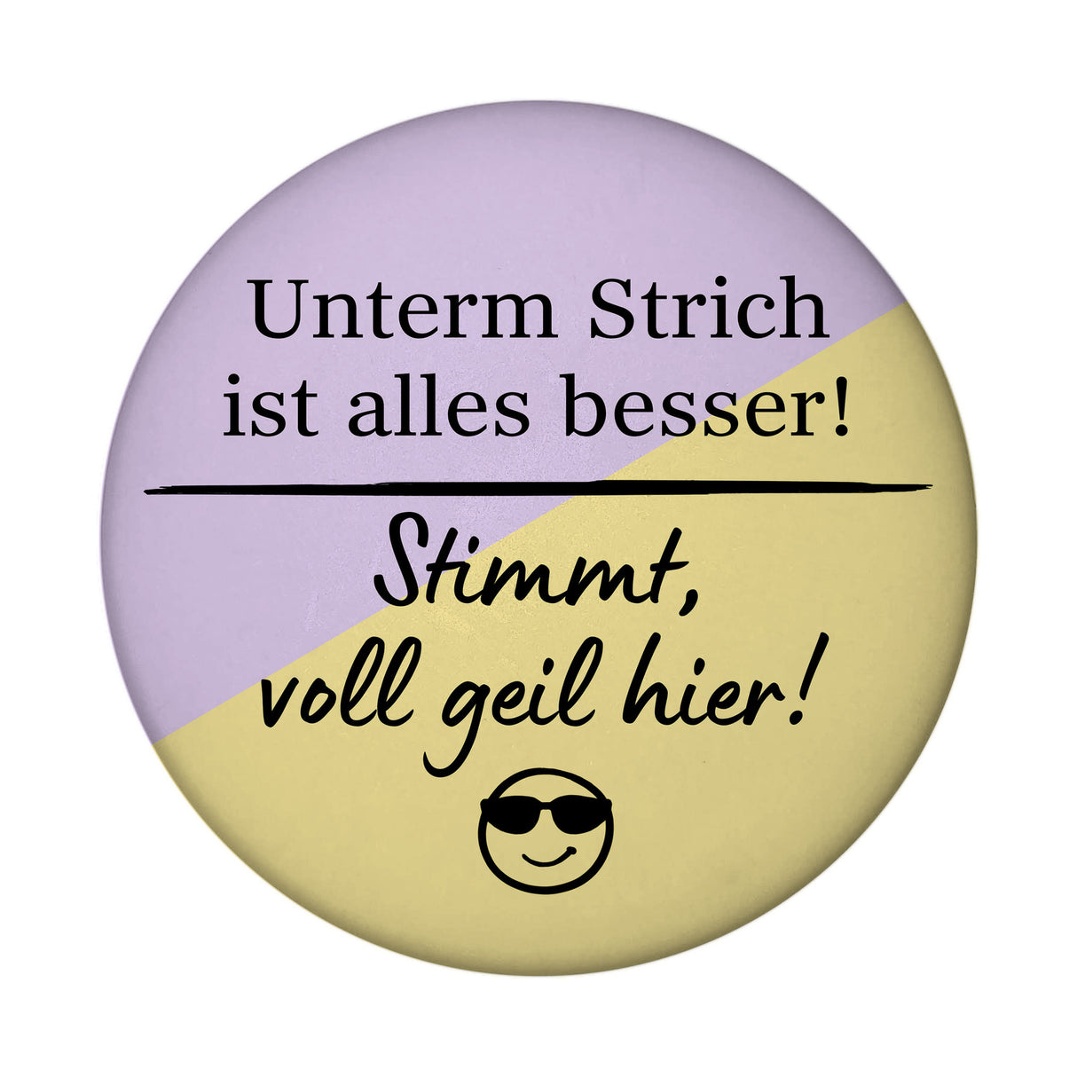 - Knall dich aus dem Alltag heraus mit unserem runden Magneten! Er trägt den lustigen Spruch "Unterm Strich ist alles besser! Stimmt, voll geil hier!" und zaubert dir sofort ein Lächeln ins Gesicht.
