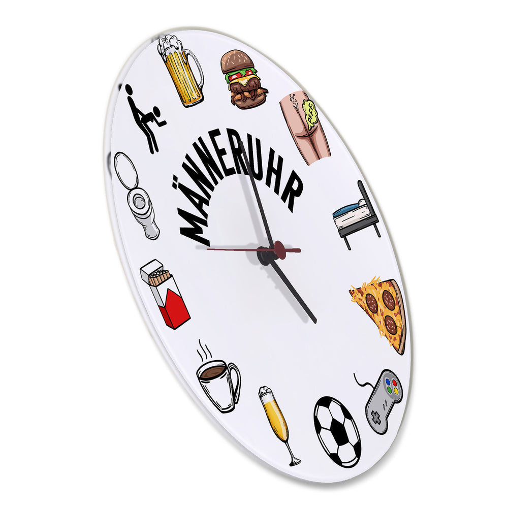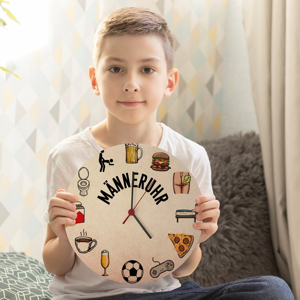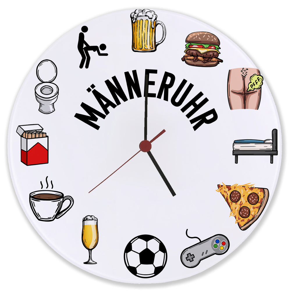 Suchst du nach einem originellen und humorvollen Geschenk für einen Mann? Dann ist die Männeruhr Wanduhr genau das Richtige für dich! Diese witzige Uhr ist nicht nur ein echter Hingucker, sondern auch ein praktischer Scherzartikel, der garantiert für Lacher sorgt. Egal ob für den besten Freund, den Bruder oder den Kollegen – diese Uhr zaubert jedem ein Lächeln ins Gesicht.Die Uhr ist in drei Varianten erhältlich: 26,5 cm aus MDF für rustikalen Charme, 28 cm aus Alu-Verbund für modernen Style oder 30 cm aus Glas für ein elegantes Finish. Einfach mit einem Nagel an der Wand befestigen und schon weißt du genau, wann es Zeit für Männeraktivitäten ist. Ob für den kahlen Fleck an der Wand oder als ausgefallene Deko – diese Wanduhr bringt Schwung in jede Bude. Sie eignet sich hervorragend als Geburtstagsgeschenk oder Party-Überraschung. Es gibt unzählige Uhren, aber so eine hast du sicherlich noch nicht gesehen. Also, worauf wartest du? Hol dir heute noch deine lustige Männeruhr und mach einem lieben Menschen eine Freude!