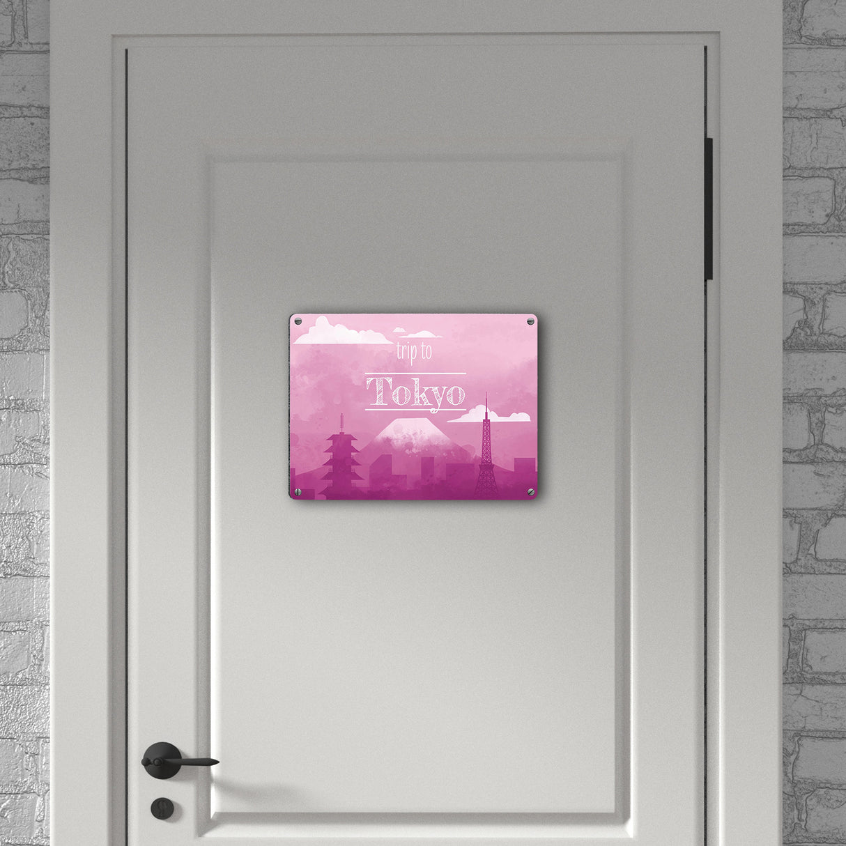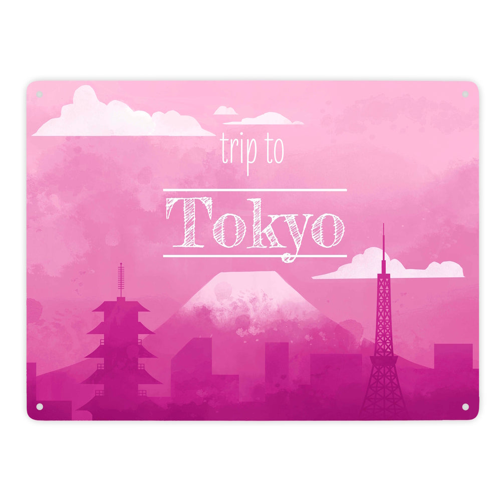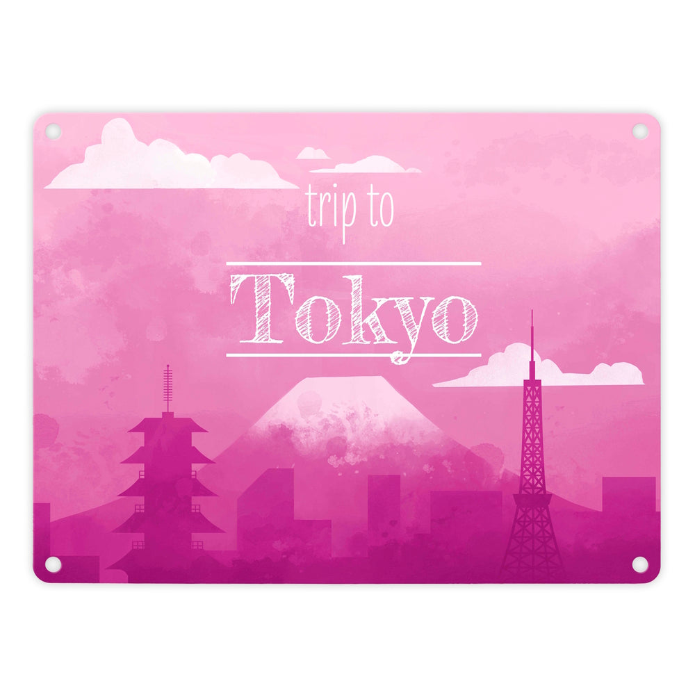 Metallschild in 15x20 cm für Fans von Städtetrips mit der Silhouette von Tokyo in pink