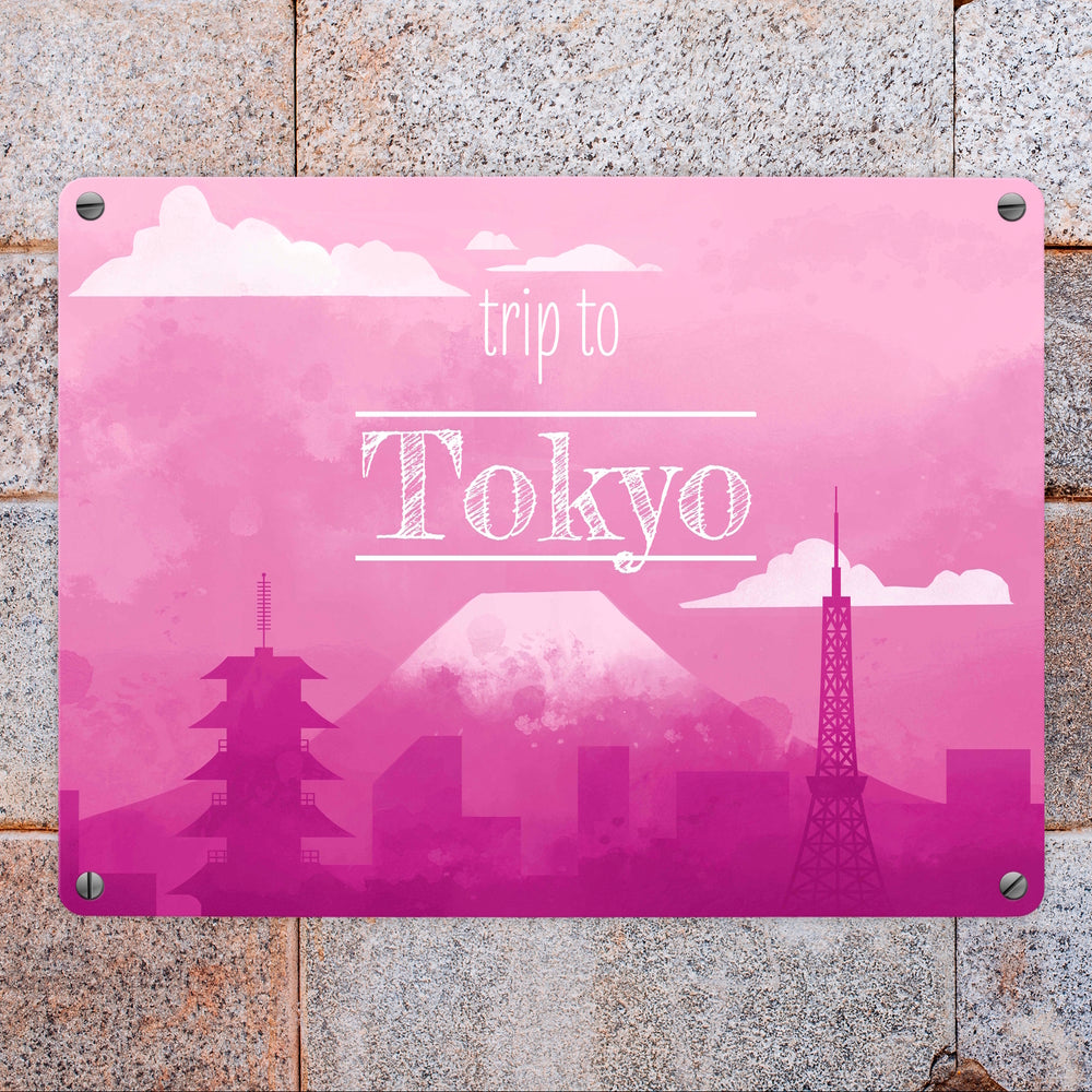 - 1x Metallschild in 15x20 cm für Fans von Städtetrips mit der Silhouette von Tokyo in pink in der gewählten Größe