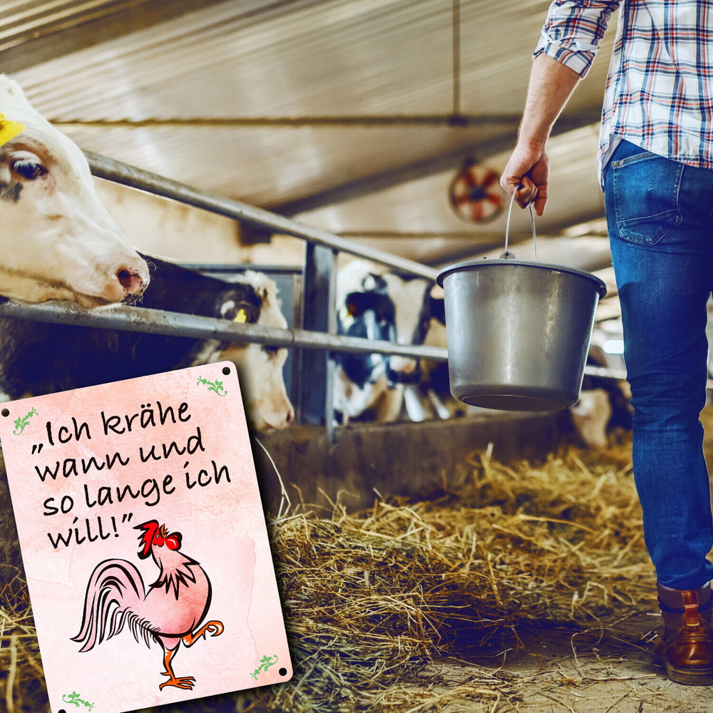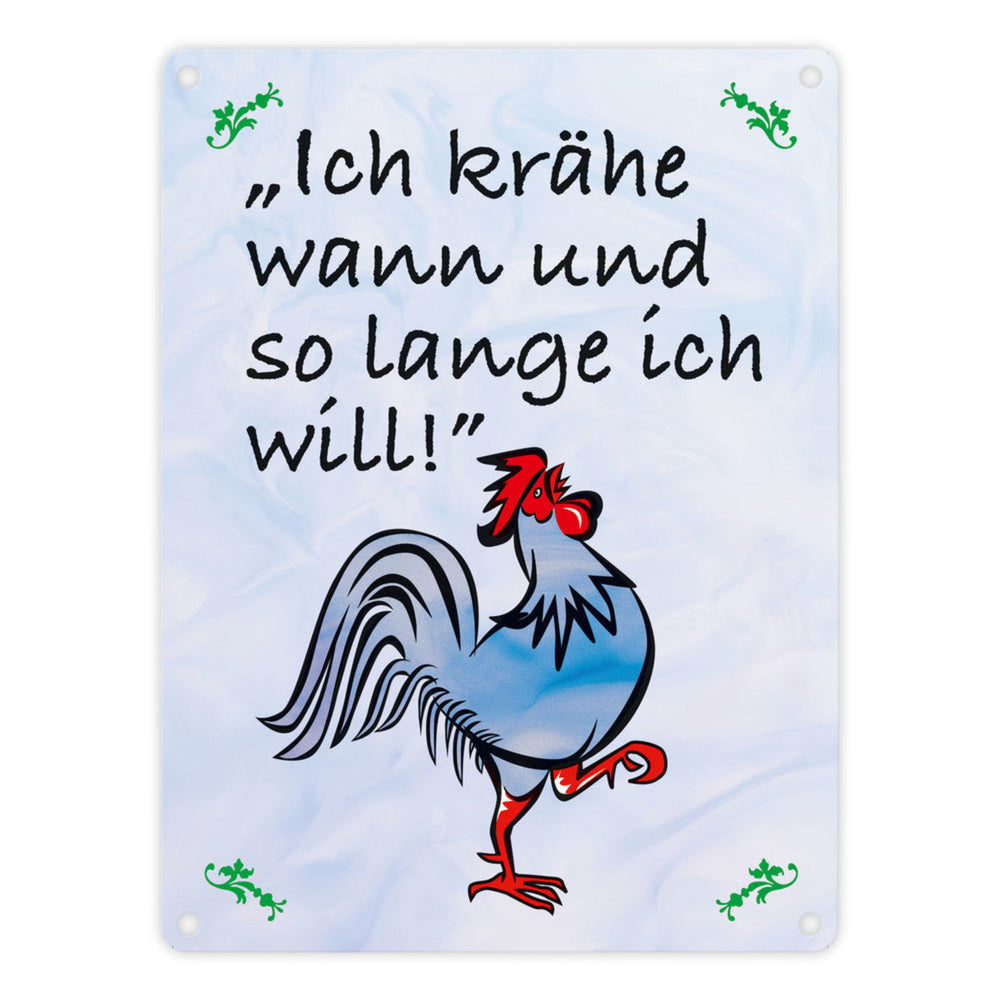 • 1x Metallschild mit Hahn und Spruch: Ich krähe wann und so lange ich will in der gewählten Größe