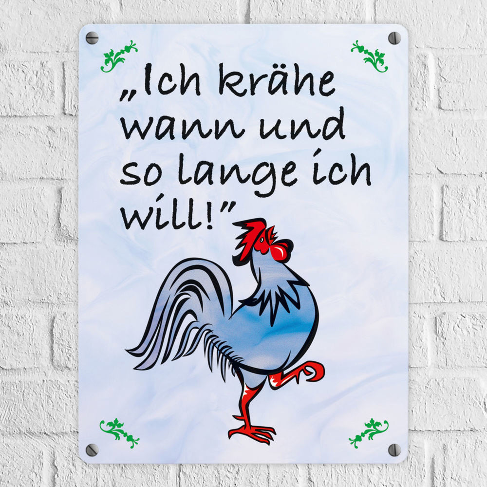 Metallschild mit Hahn und Spruch: Ich krähe wann und so lange ich will