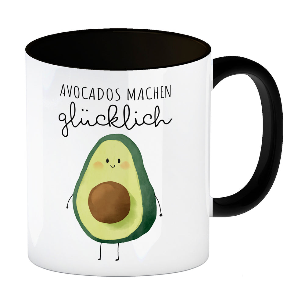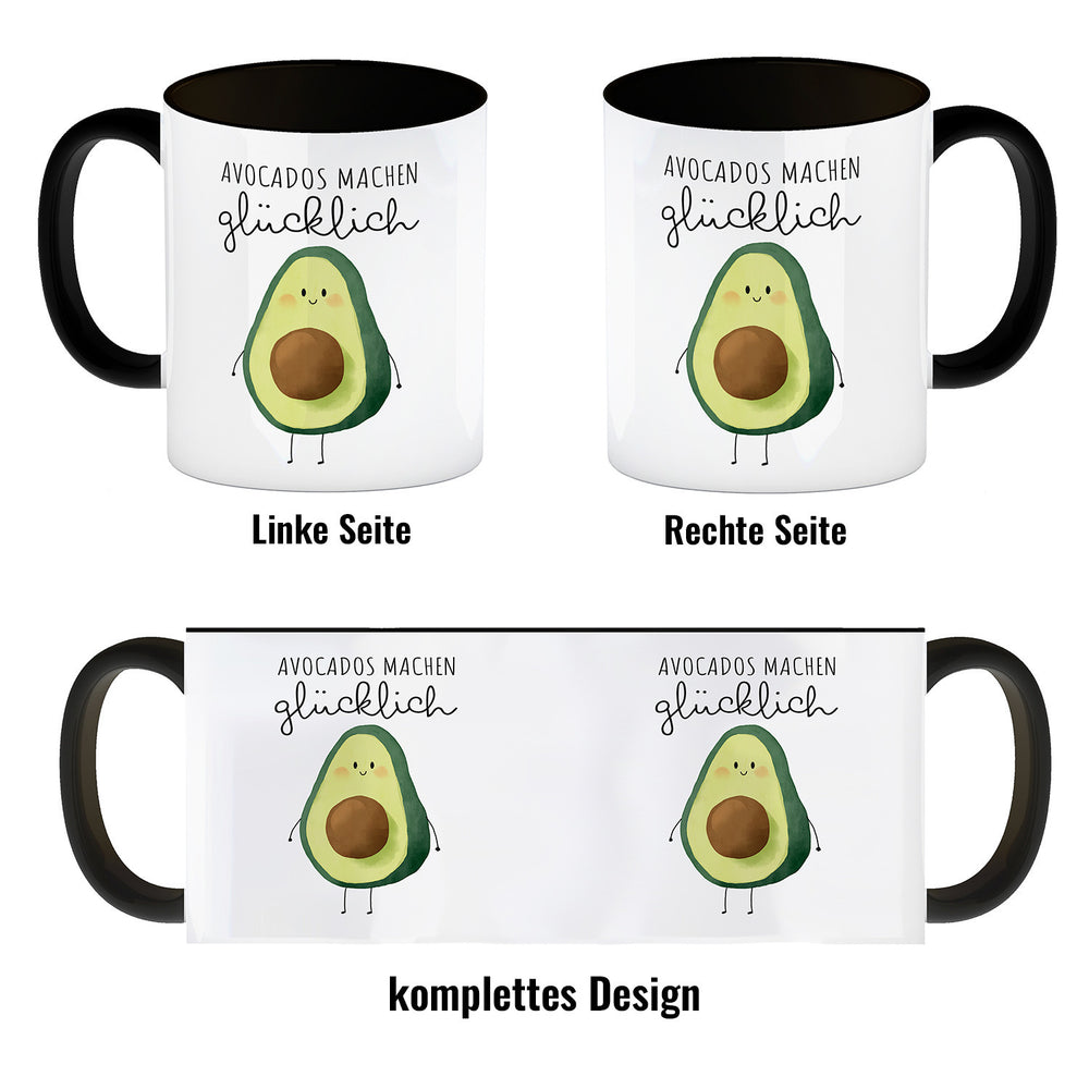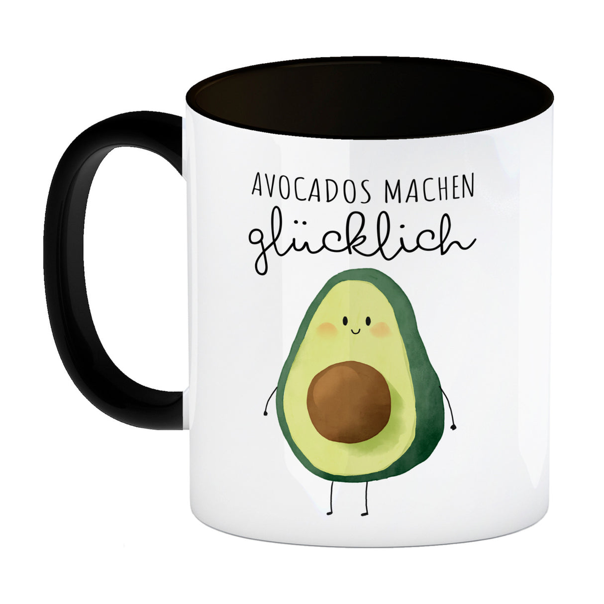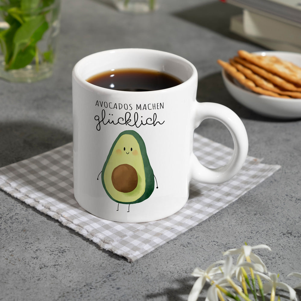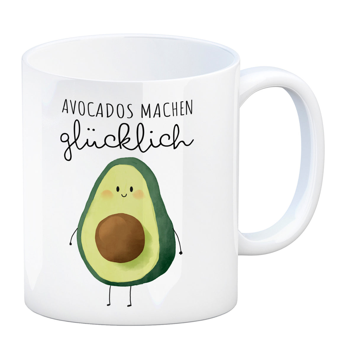 • 1x Niedliche Avocado Kaffeebecher mit Spruch Avocados machen glücklich in der gewählten Ausführung