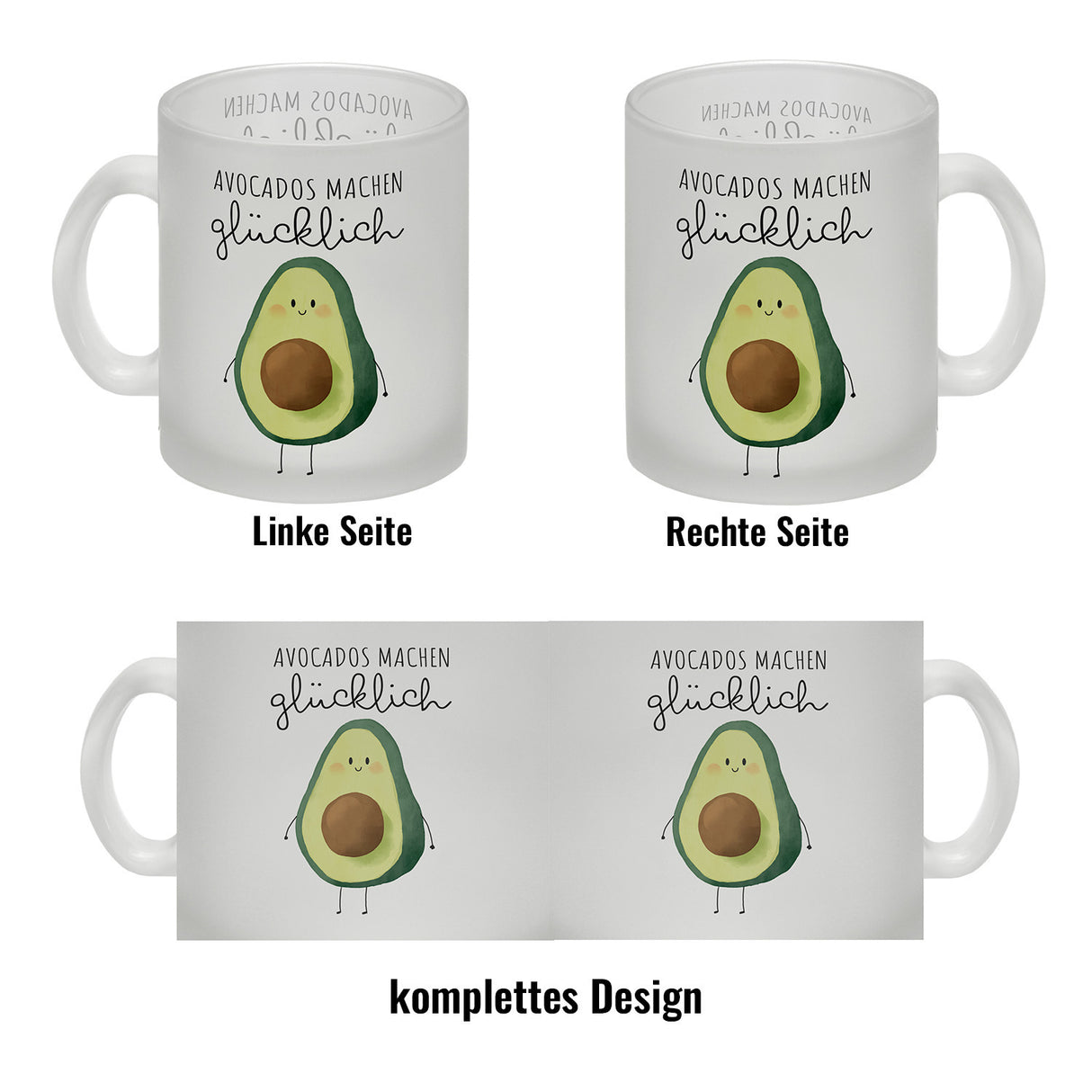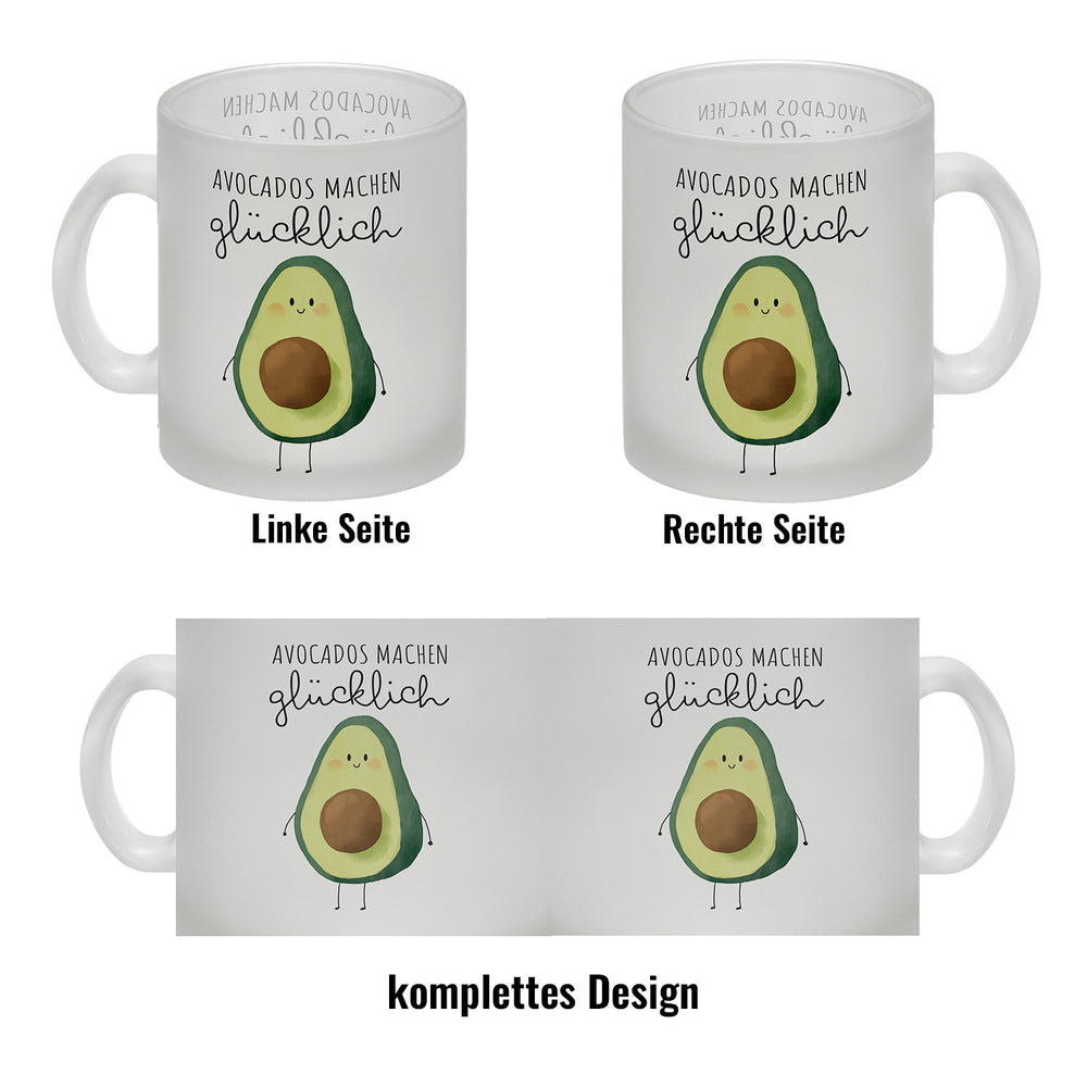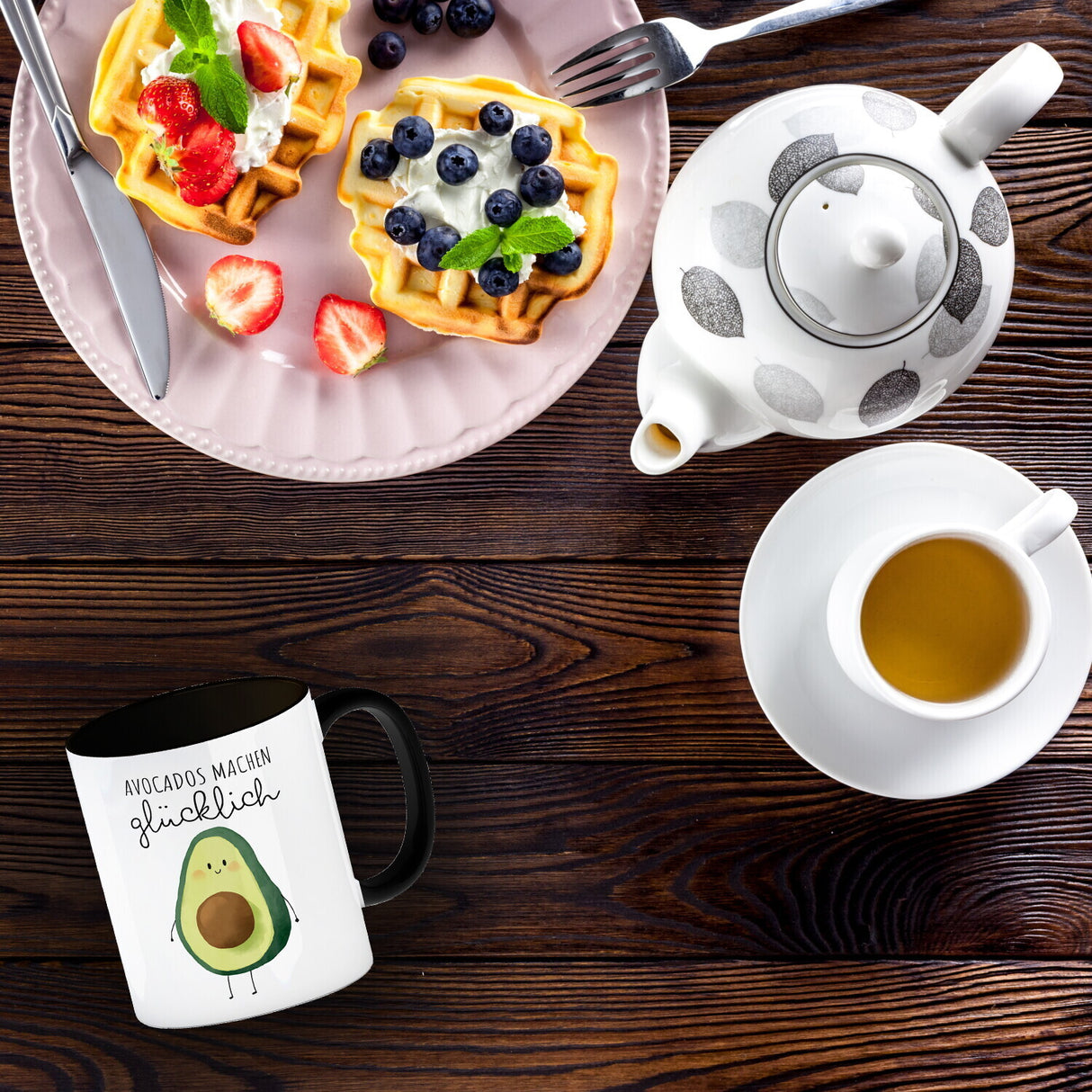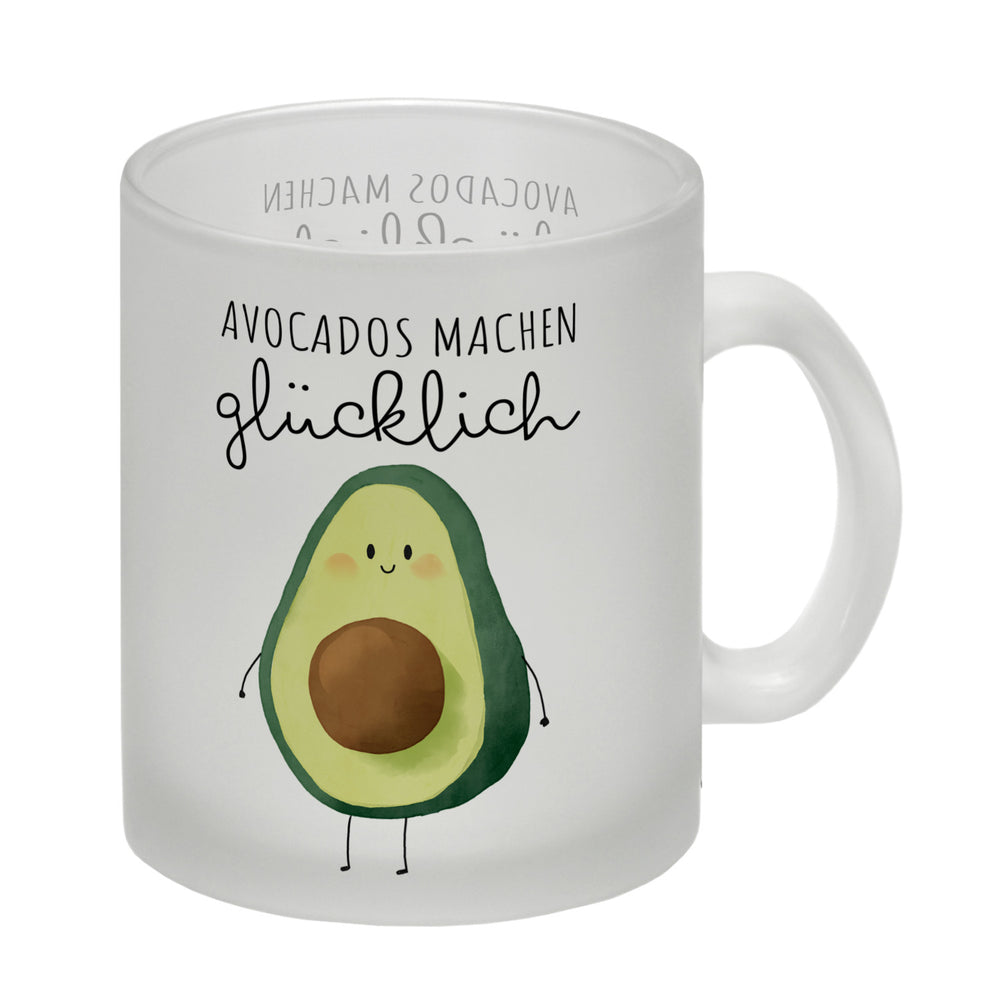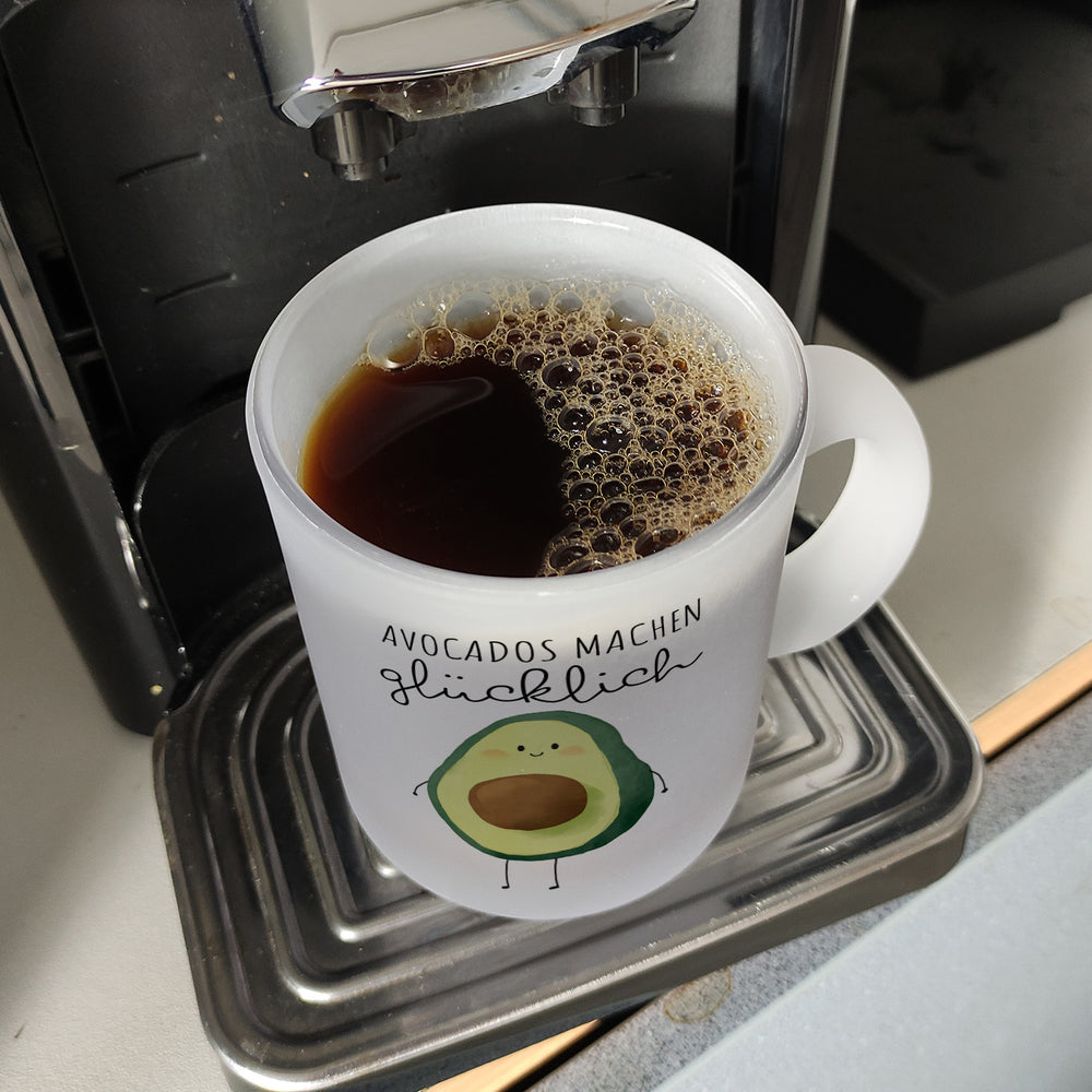 • 1x Niedliche Avocado Kaffeebecher mit Spruch Avocados machen glücklich in der gewählten Ausführung