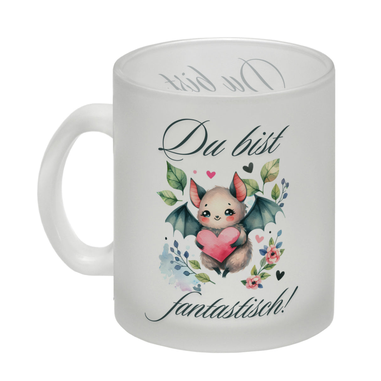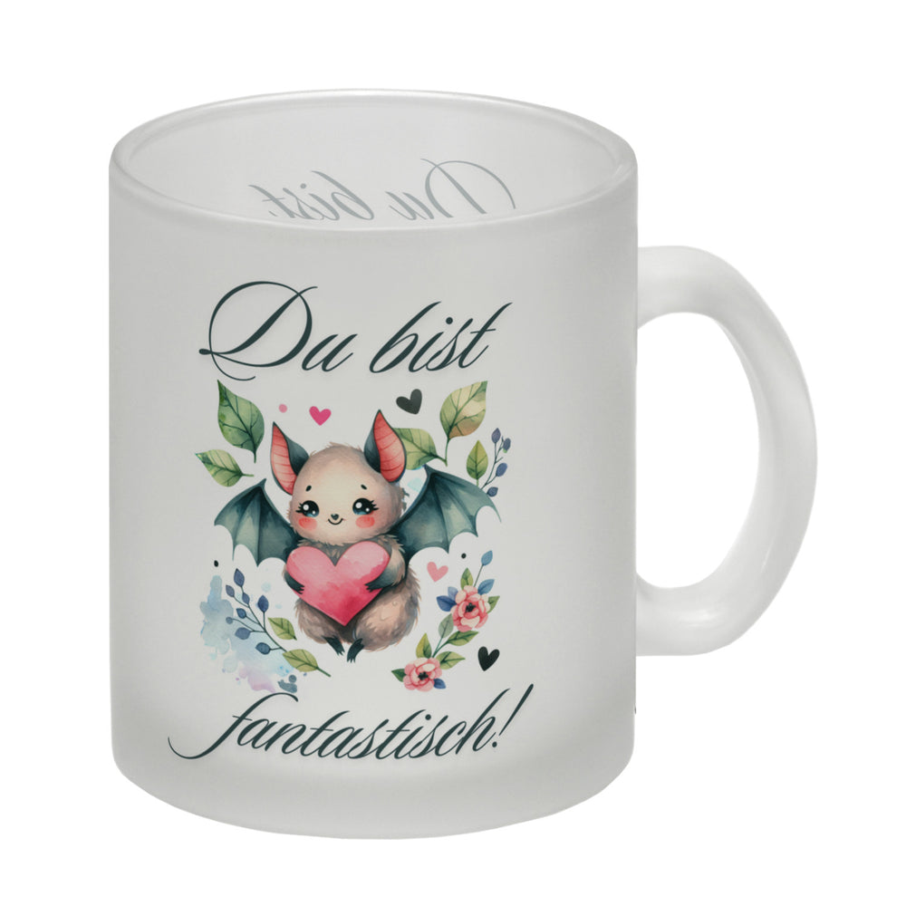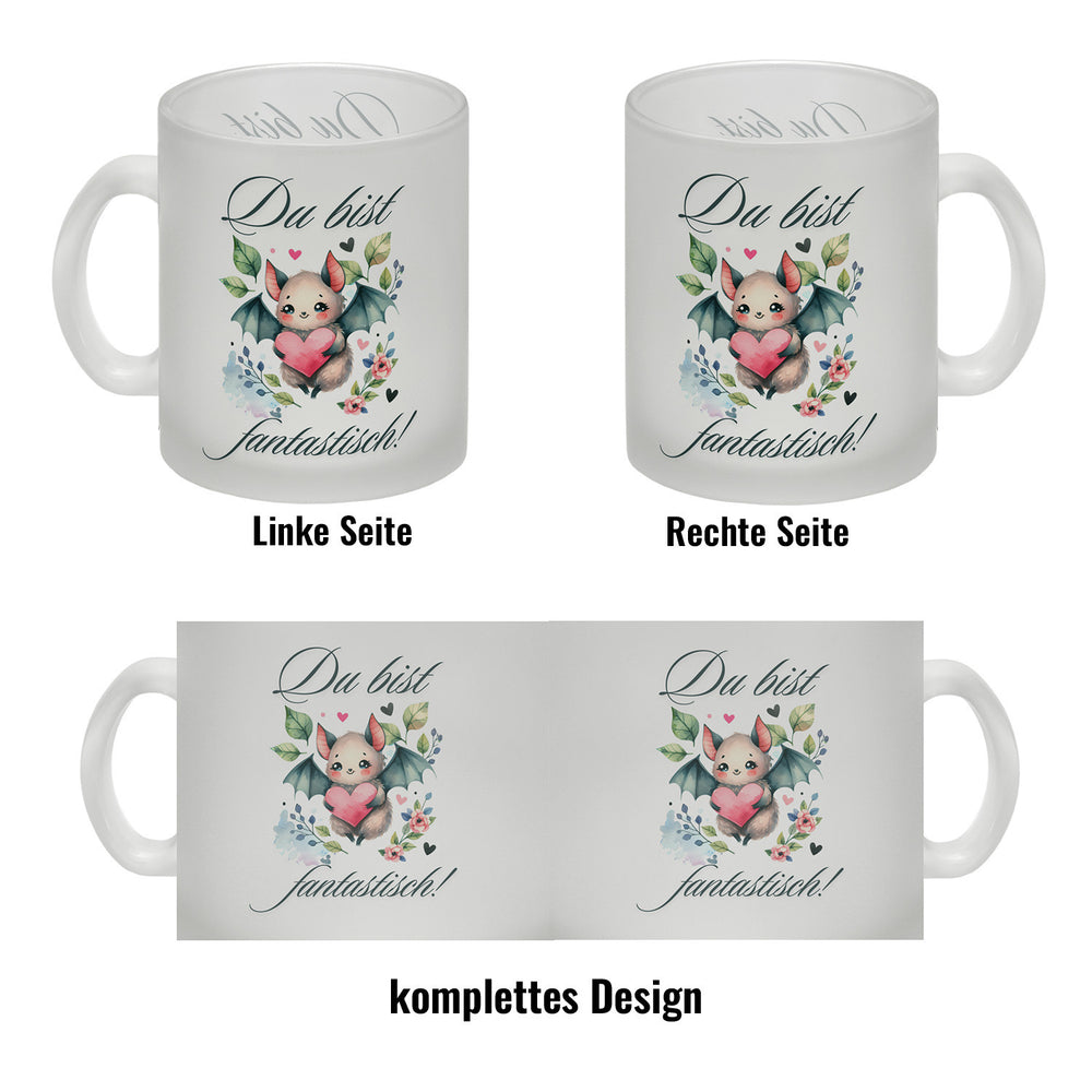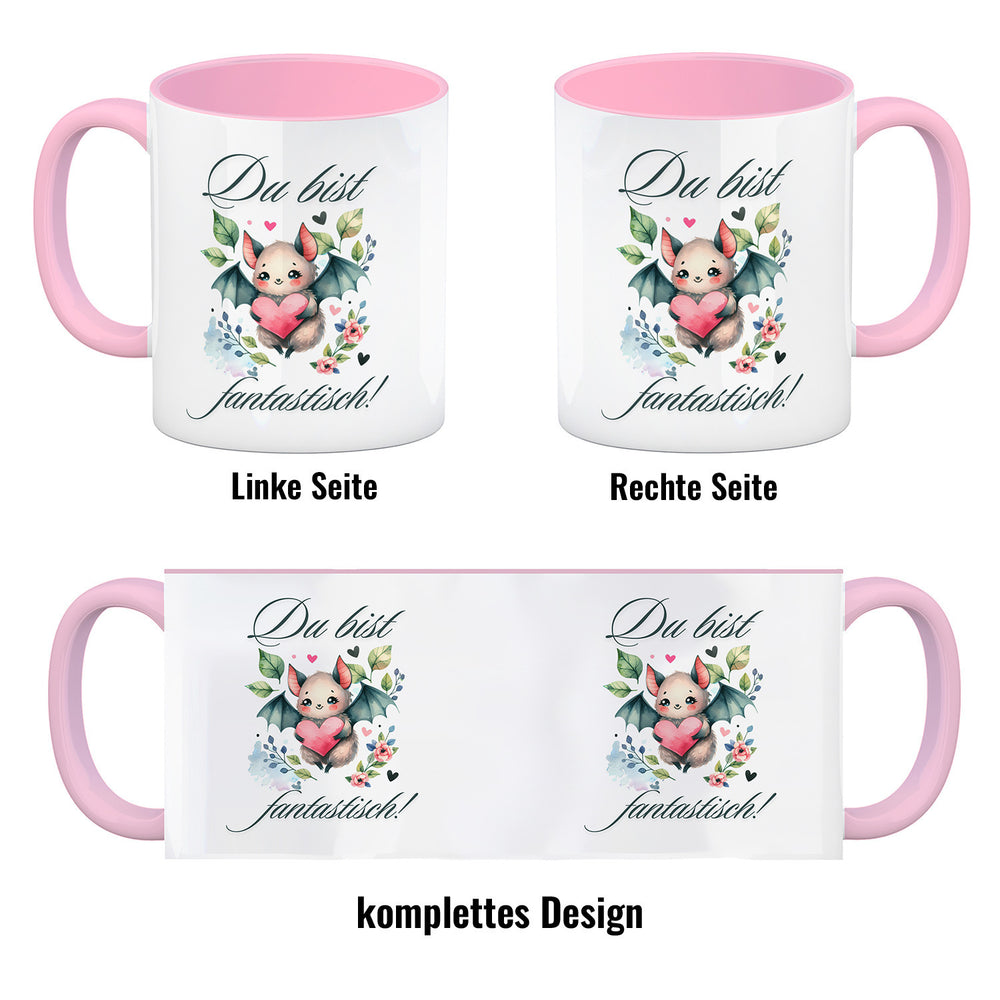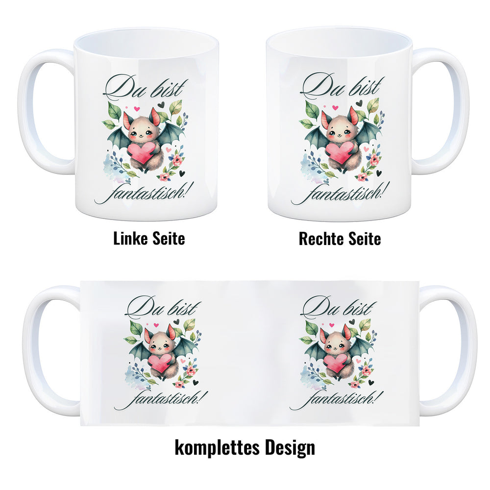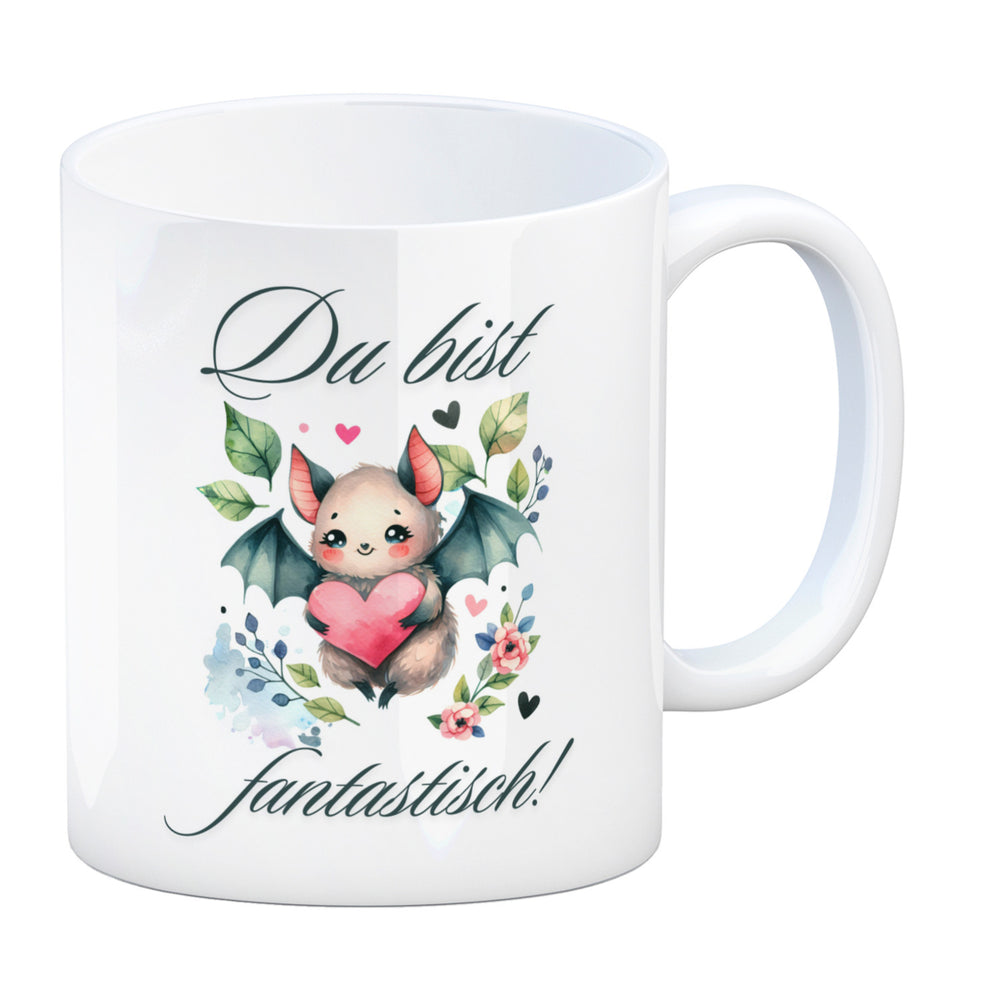 • 1x niedliche Fledermaus mit Herz Kaffeebecher mit Spruch Du bist fantastisch in der gewählten Ausführung