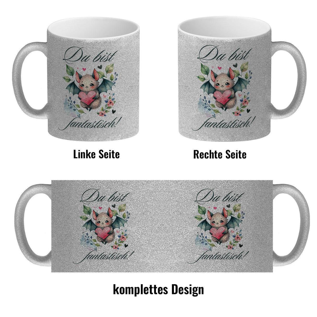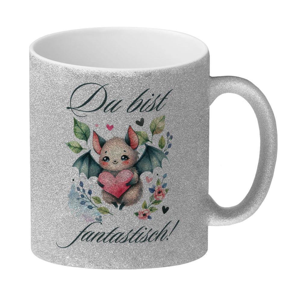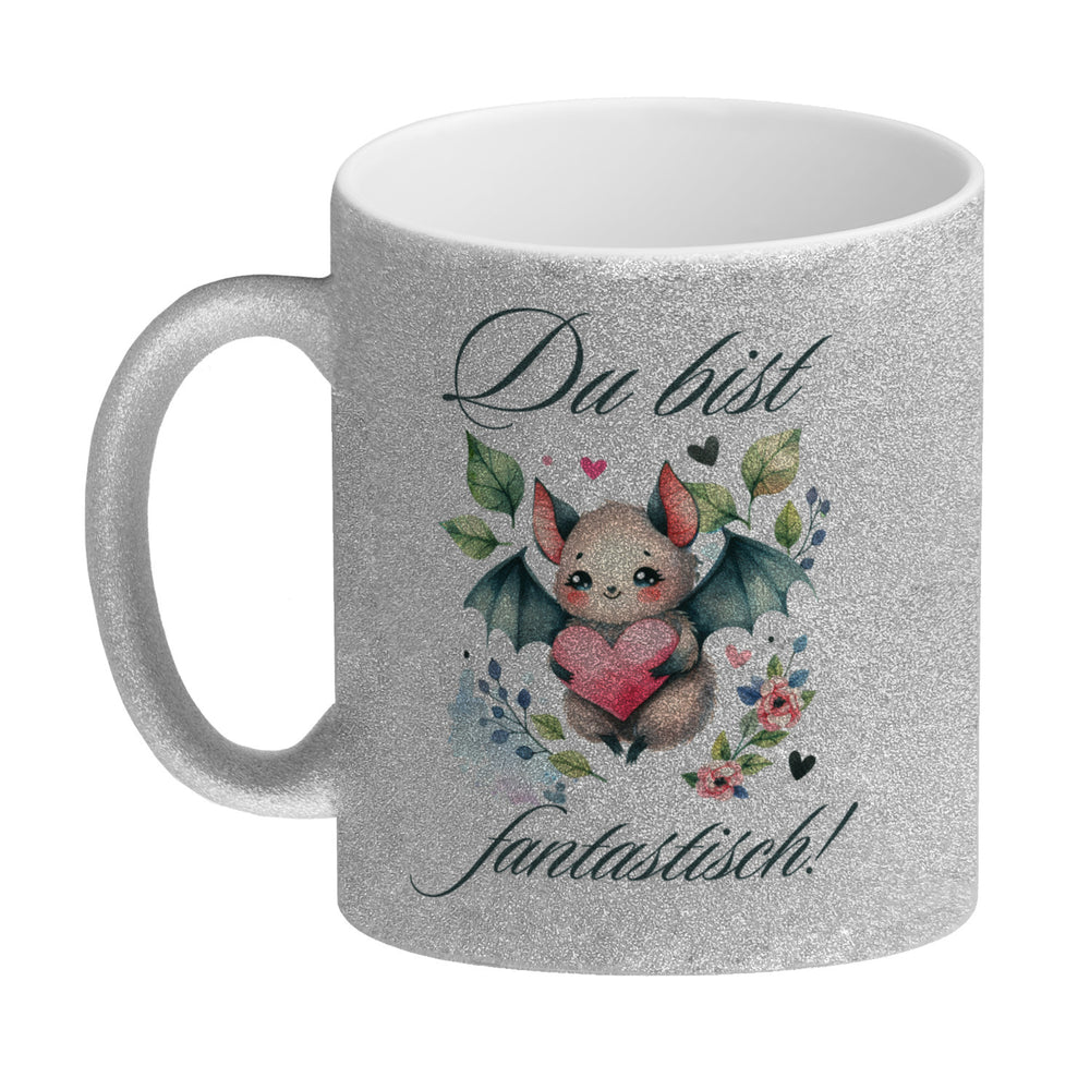 Guten Morgen, Sonnenschein! Unser Kaffeebecher mit der süßen Fledermaus, die ein Herz hält und mit dem Spruch „Du bist fantastisch“, ist der perfekte Start in den Tag. Ein echtes Must-Have für Tierliebhaber und Morgenmuffel gleichermaßen! Diese charmante Fledermaus mit strahlenden Augen zaubert jedem ein Lächeln ins Gesicht und verbreitet pure Herzlichkeit. Erhältlich in verschiedenen Varianten: ob als einfache weiße Tasse, mit farbigem Henkel und Innenseite, als elegante Glastasse oder in der glänzenden Silberedition mit Glitzereffekt – hier ist für jeden Geschmack etwas dabei! Mit größter Sorgfalt in unserer deutschen Manufaktur bedruckt, ist dieser Becher das ideale Zubehör für deinen Morgenkaffee, Tee oder heiße Schokolade.Doch dieser Becher kann noch mehr! Er ist spülmaschinenfest und aus hochwertigem Keramik gefertigt, was ihn robust und langlebig macht. Ob für Kollegen, Freunde oder Familienmitglieder – dieser bezaubernde Becher eignet sich als Allround-Geschenk für jede Gelegenheit. Jeder Schluck wird zu einem Moment der Freude und erinnert daran, dass wir alle fantastischer sind, als wir glauben. Überrasche jemanden (oder dich selbst) mit diesem herzlichen Highlight und starte jeden Tag mit einem Lächeln!