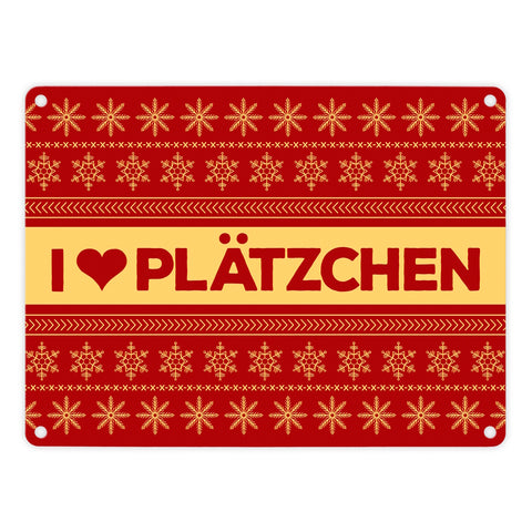I love Plätzchen Metallschild mit Weihnachtsmuster Motiv - Weihnachten Herz Sterne Schnee Punkte Muster