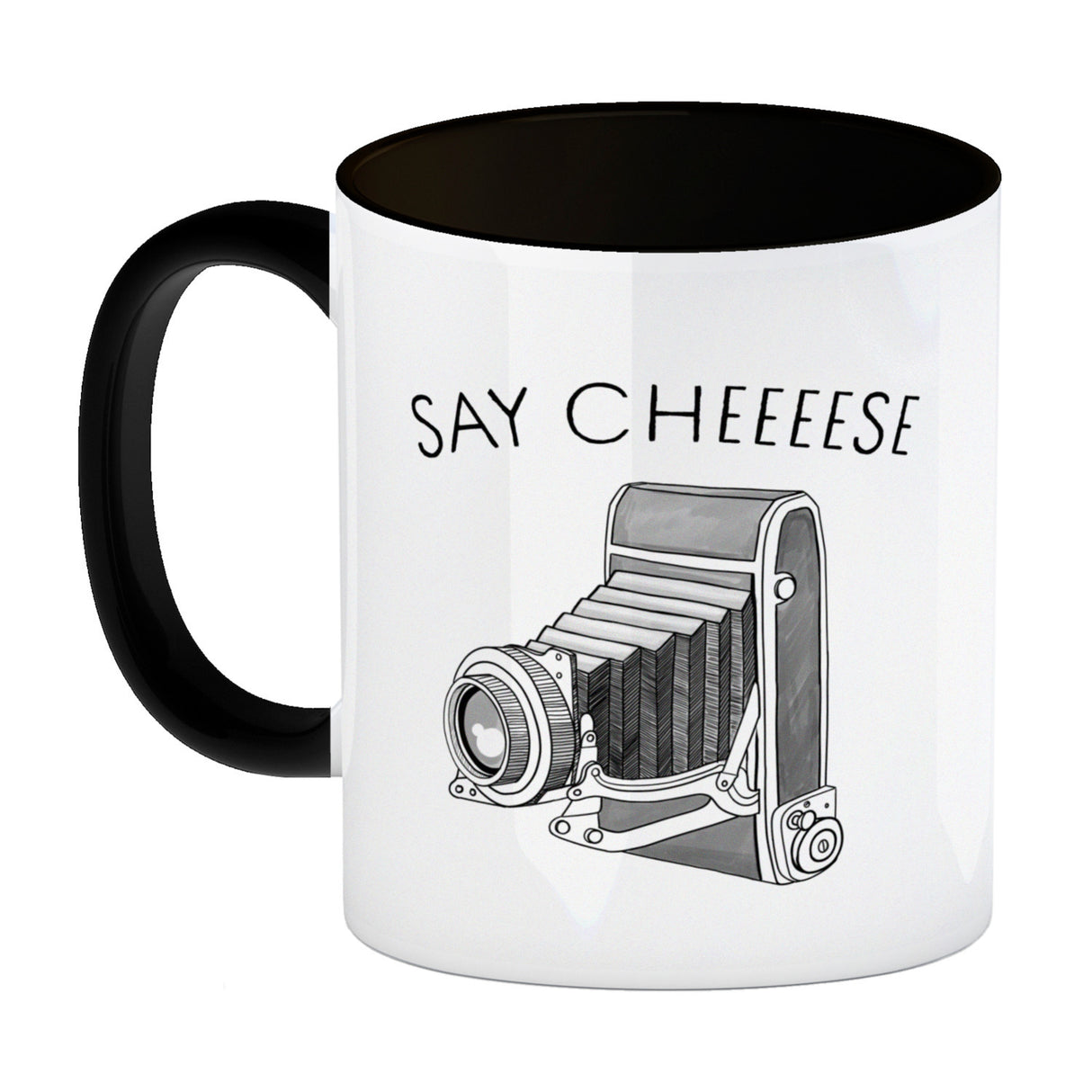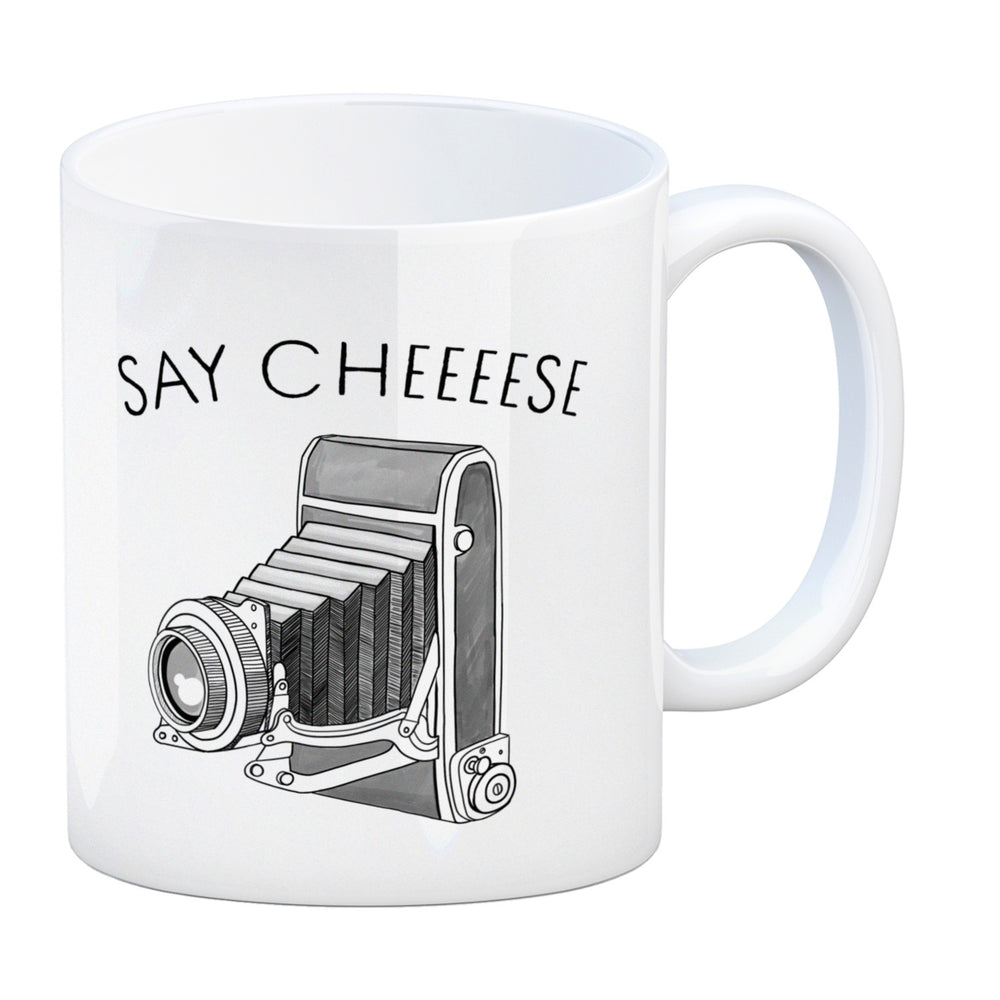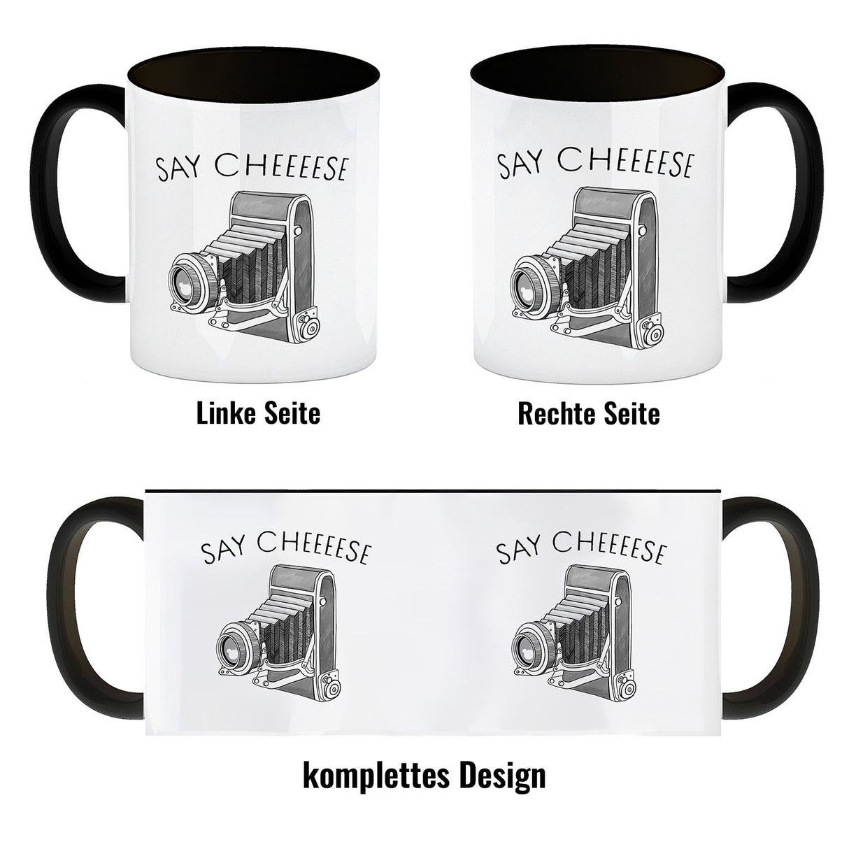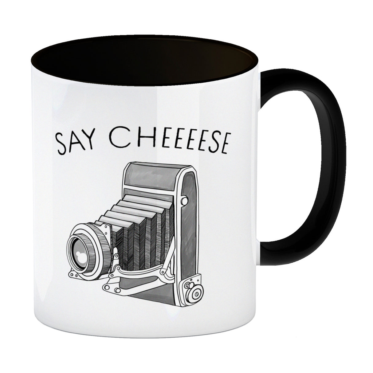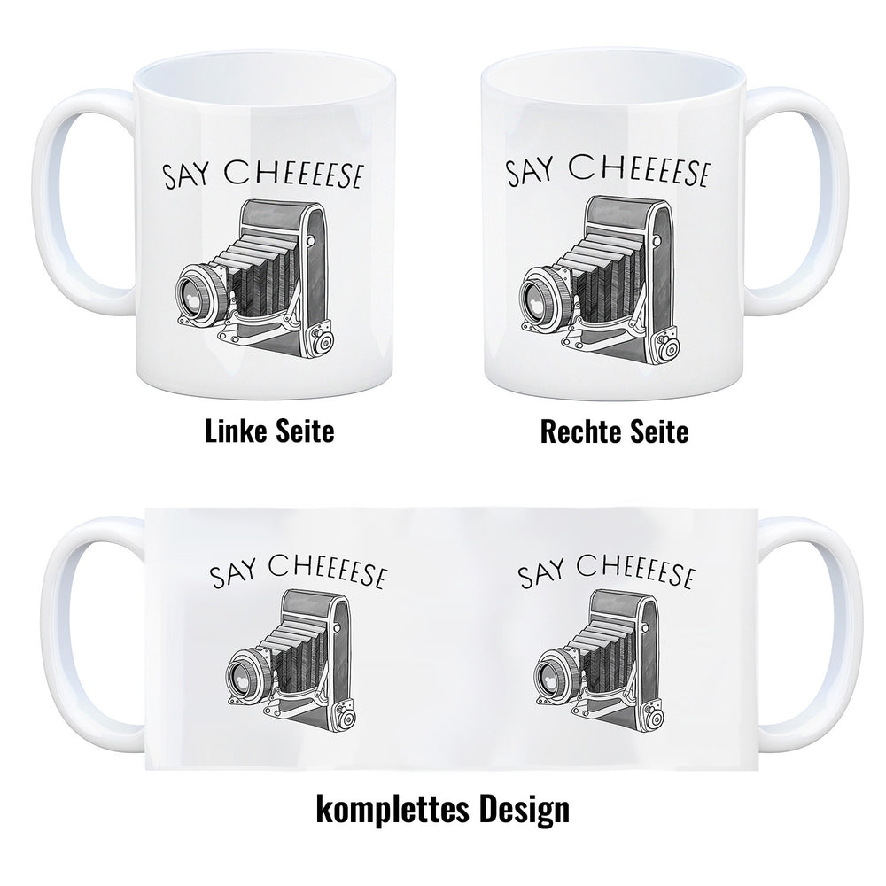- 1x Say cheeeese Kaffeebecher für Fotografen mit Retro Kamera Motiv in der gewählten Ausführung