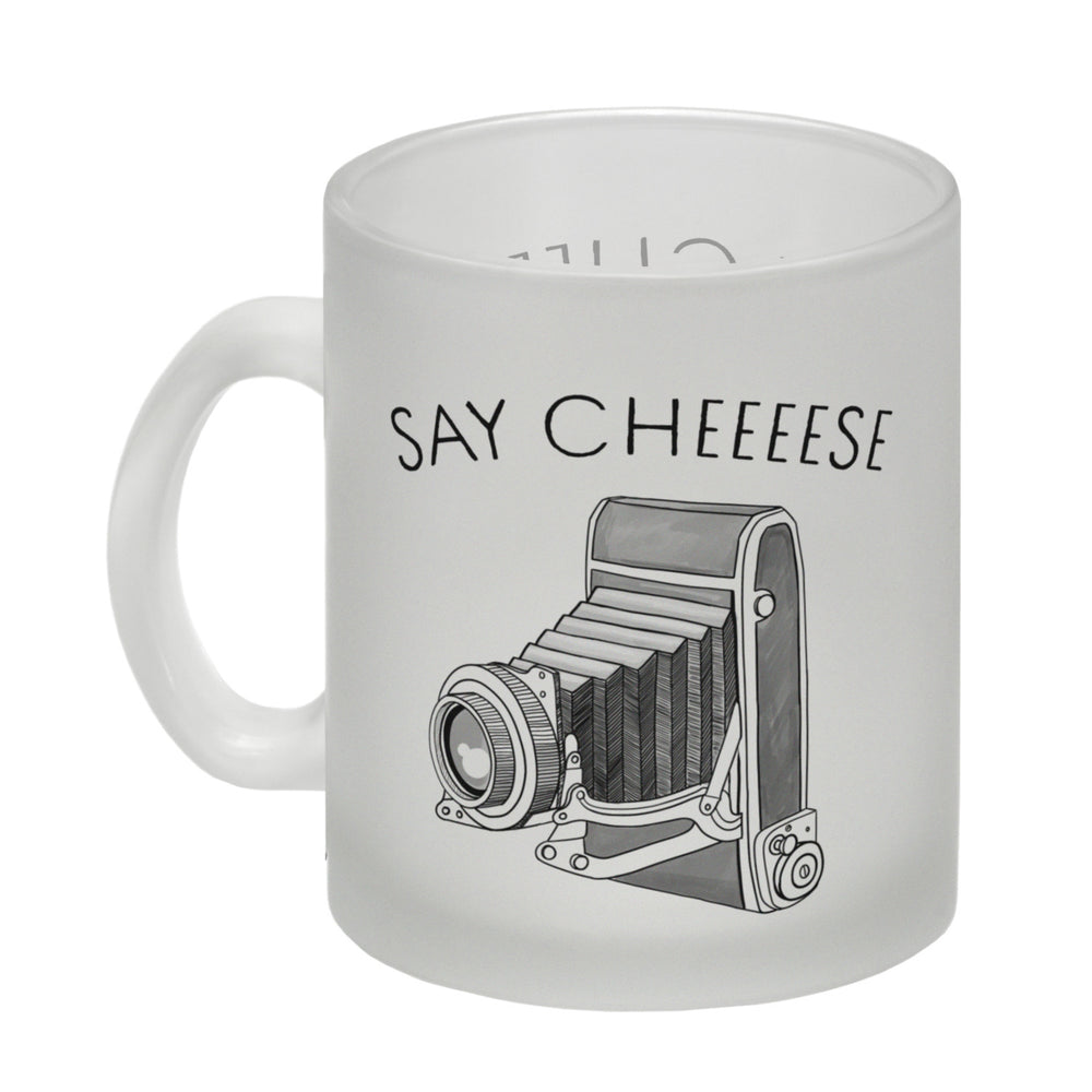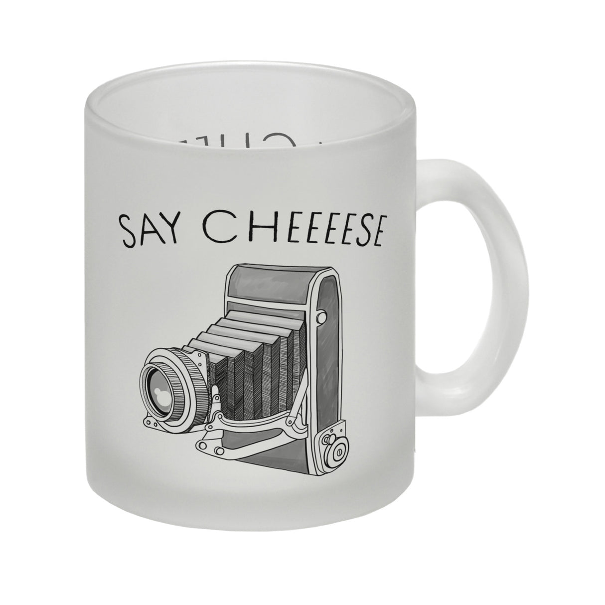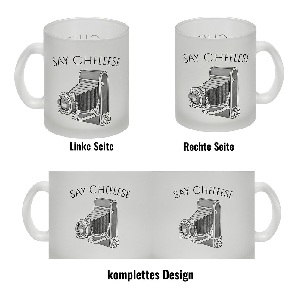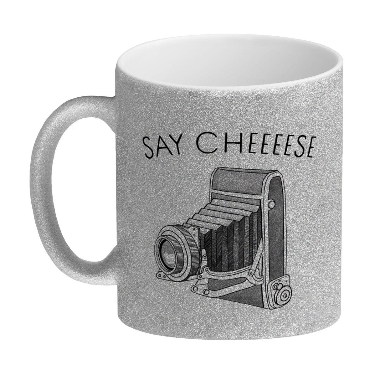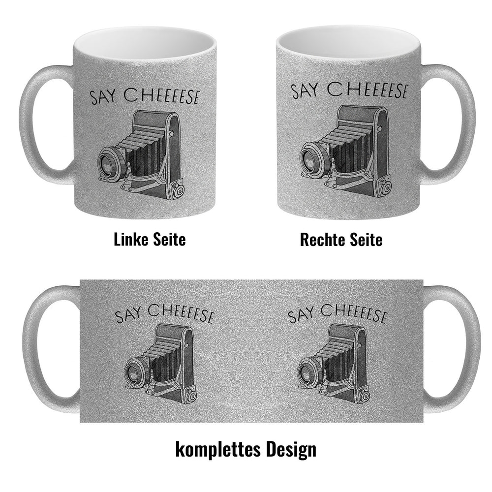 - 1x Say cheeeese Kaffeebecher für Fotografen mit Retro Kamera Motiv in der gewählten Ausführung