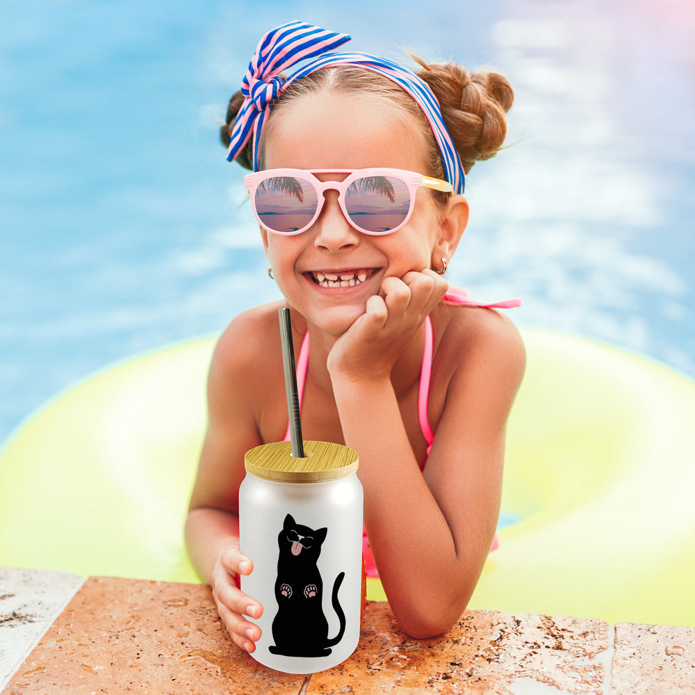 Schwarze Katze Trinkglas mit Bambusdeckel