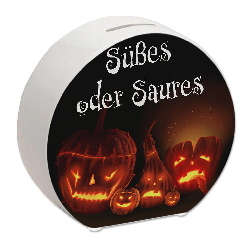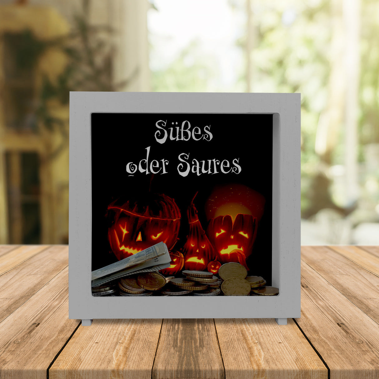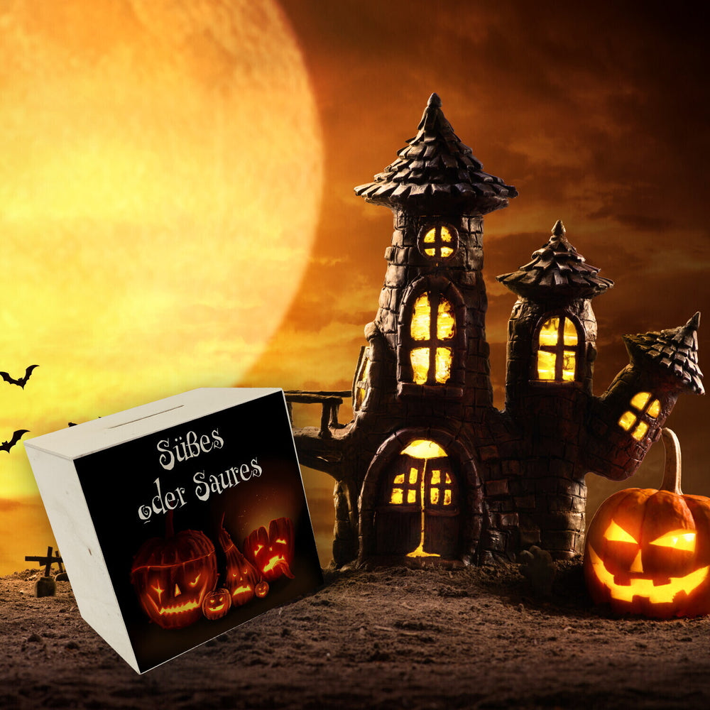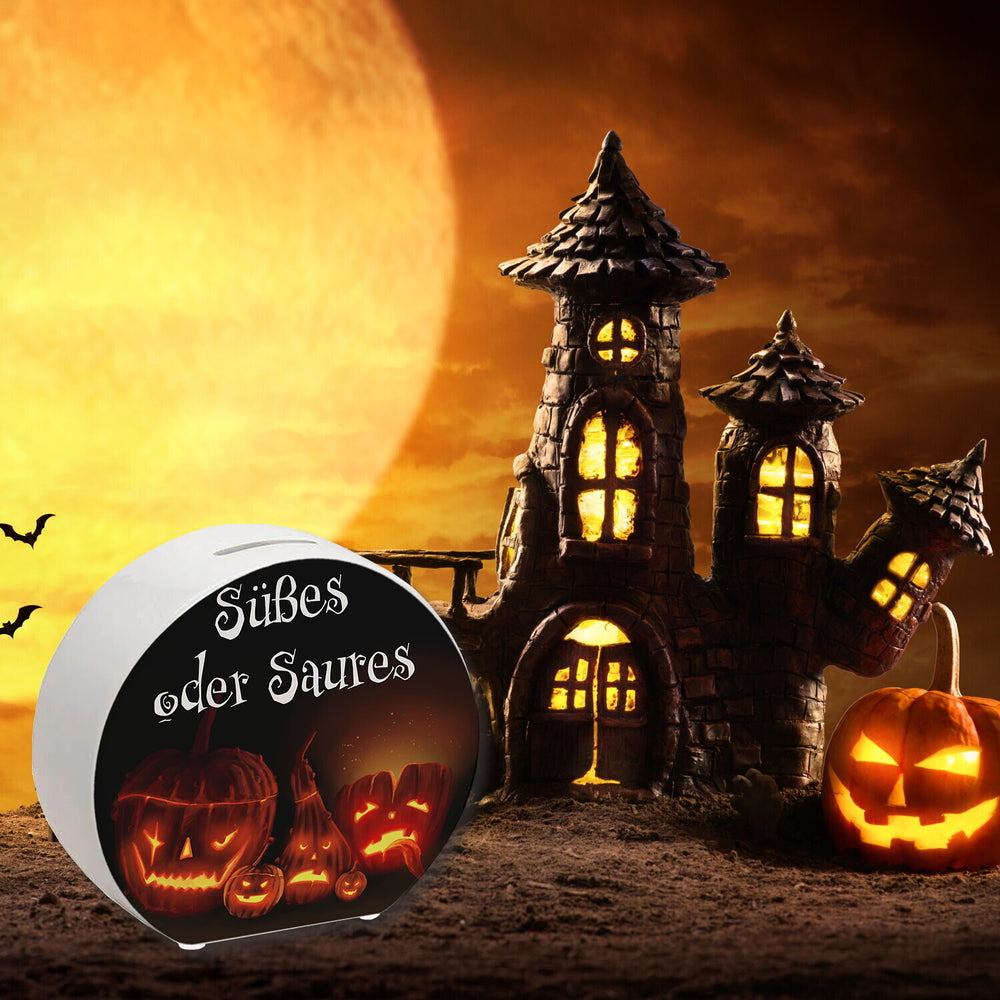 - 1x Spardose mit gruseligem Kürbisköpfe Motiv und Spruch - Süßes oder Saures in der gewählten Ausführung
