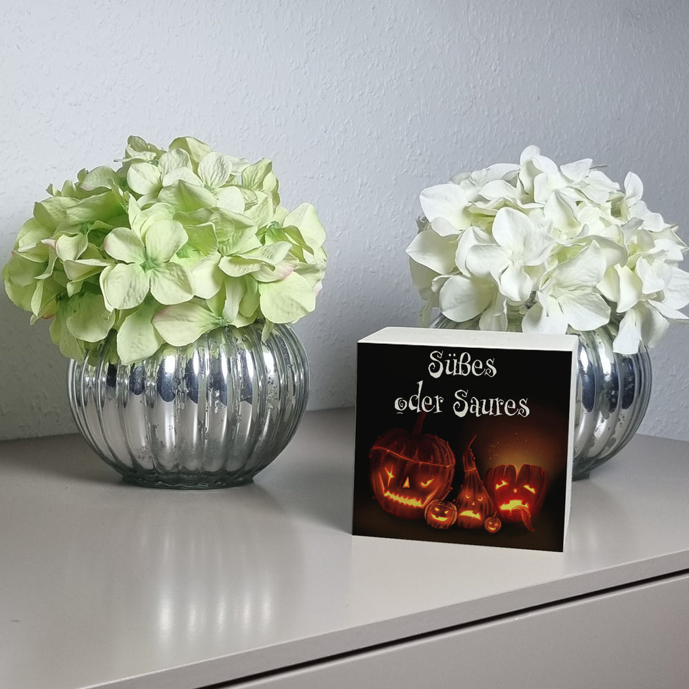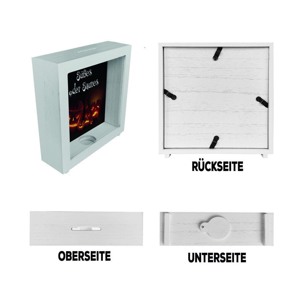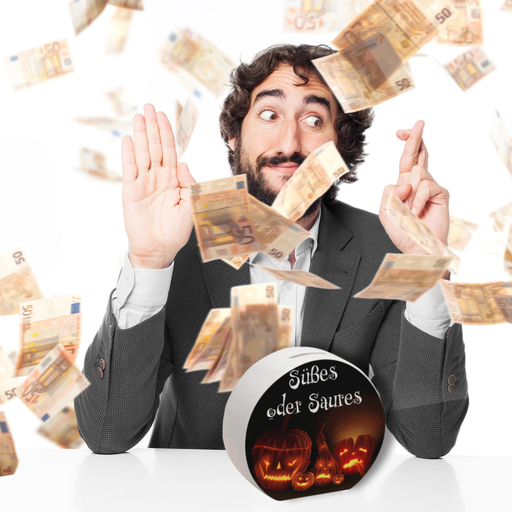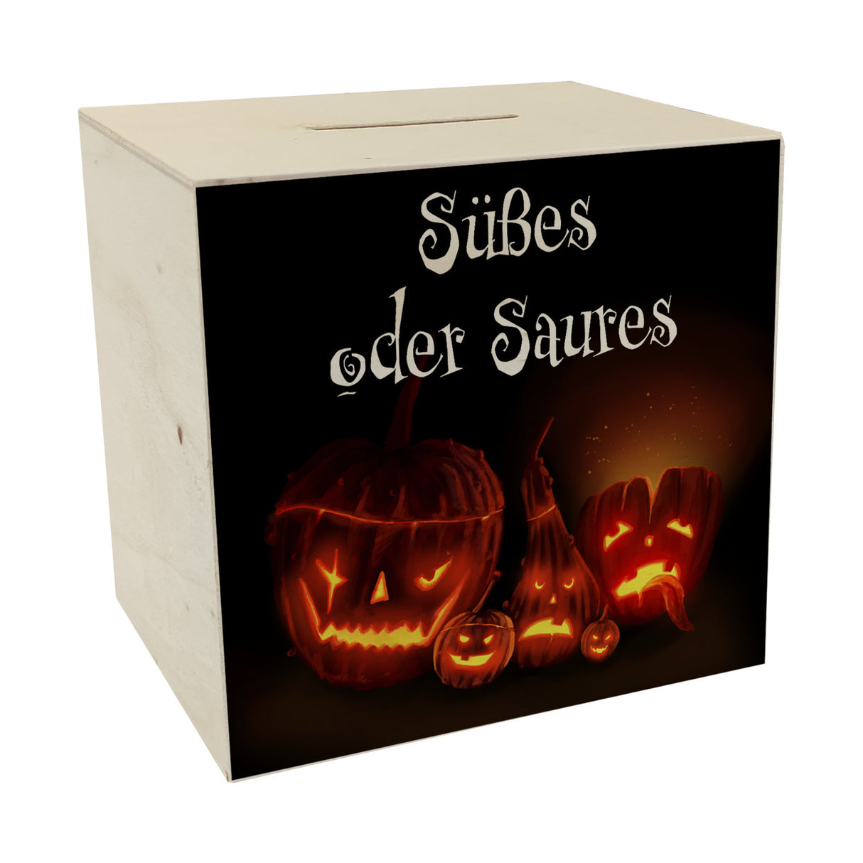 - 1x Spardose mit gruseligem Kürbisköpfe Motiv und Spruch - Süßes oder Saures in der gewählten Ausführung
