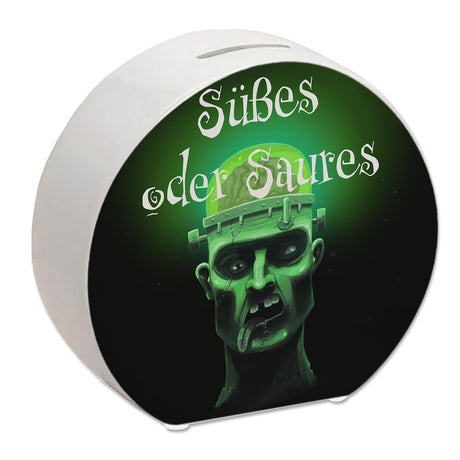 Spardose mit gruseligem Zombie Motiv und Spruch - Süßes oder Saures