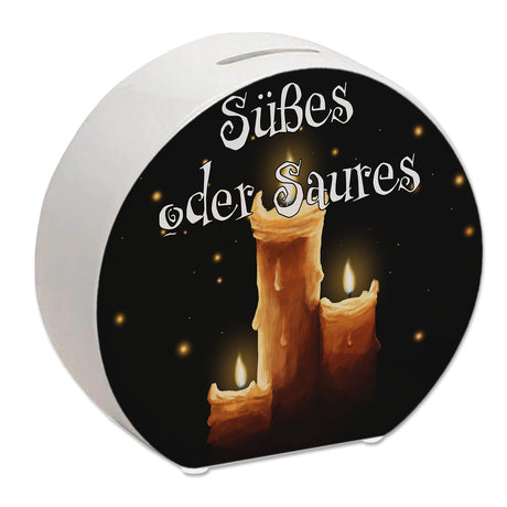 Spardose mit gruseligem Kerzen Motiv und Spruch - Süßes oder Saures