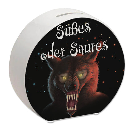 Spardose mit gruseligem Werwolf Motiv und Spruch - Süßes oder Saures