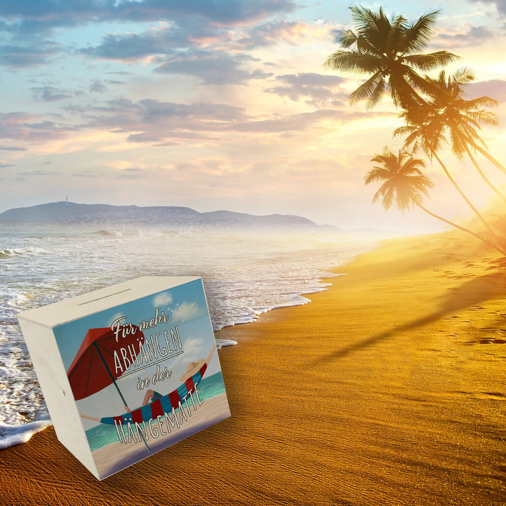 Spardose mit schönem Strandmotiv - Für mehr Abhängen in der Hängematte