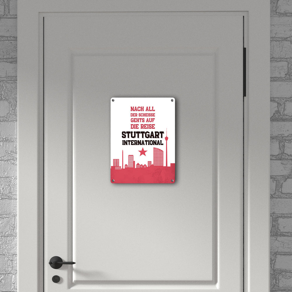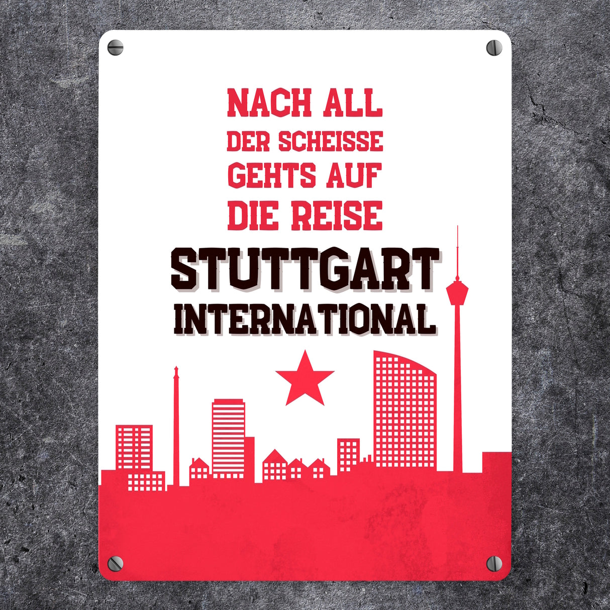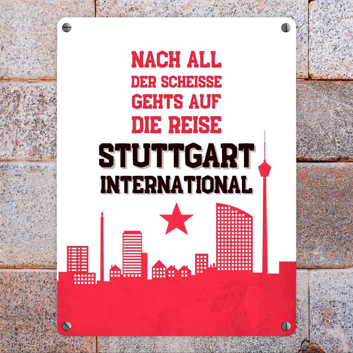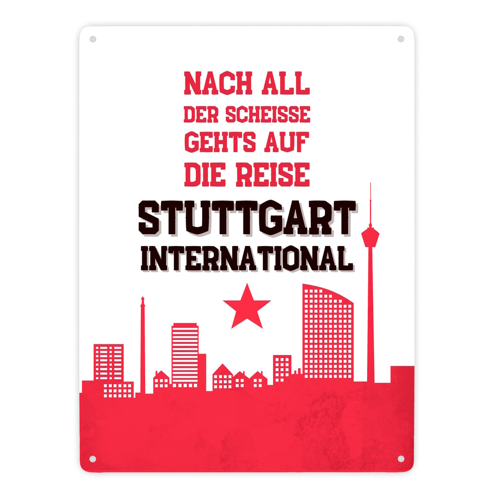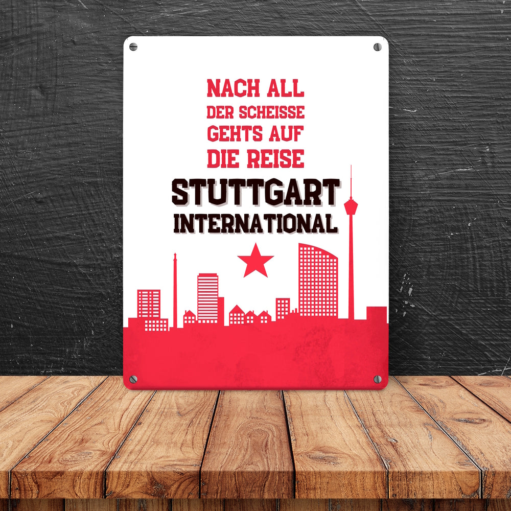 - Kick it like Schwaben! Dieses Stuttgart Europapokal Metallschild versprüht pures Stadionfeeling. Weiß-rote Farben zieren die Skyline mit Fernsehturm, während der Spruch "Nach all der Scheiße gehts auf die Reise - Stuttgart International" jeden echten Stuttgart-Fan zum Schmunzeln bringt.