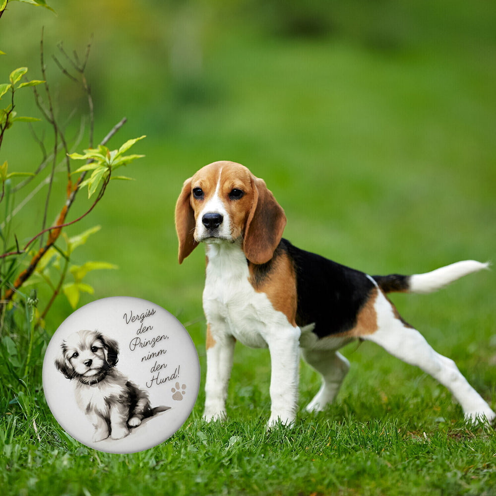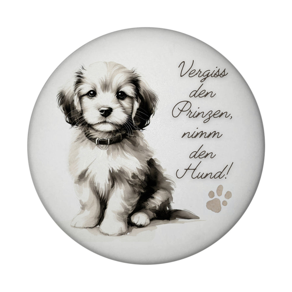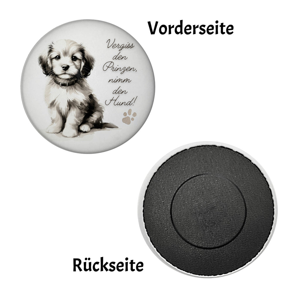 - 1x süßer Hund mit Halsband Magnet rund mit Spruch Vergiss den Prinzen nimm den Hund in der gewählten Ausführung