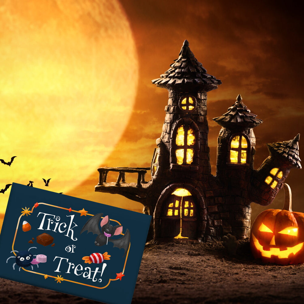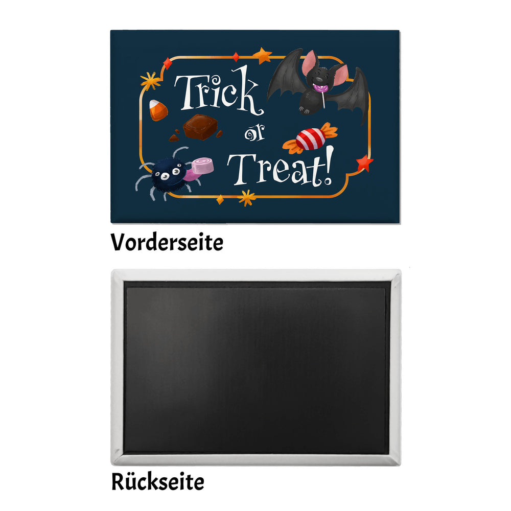 - Auf dem Magnet steht der Spruch: Trick or Treat. Als Motiv ist eine Fledermaus und eine Spinne zu sehen. Sie sind von Süßigkeiten umgeben. Der Text wird mit einem goldenen Rahmen umfasst. Der Hintergrund ist dunkelblau.