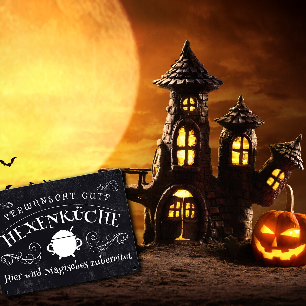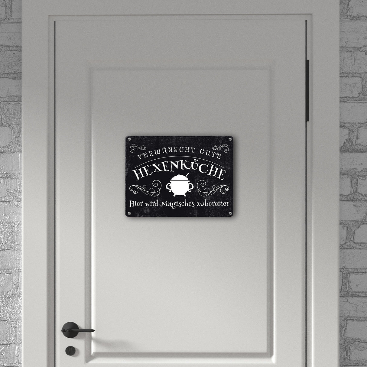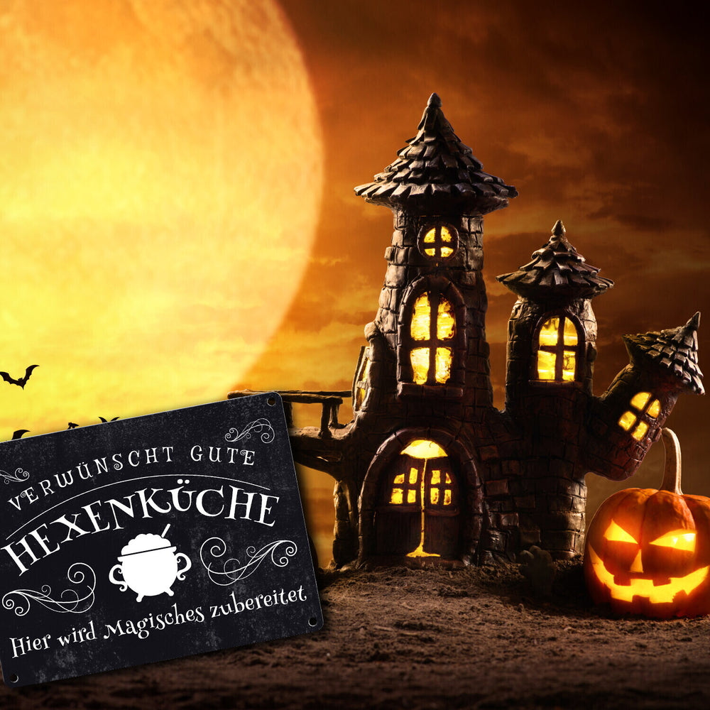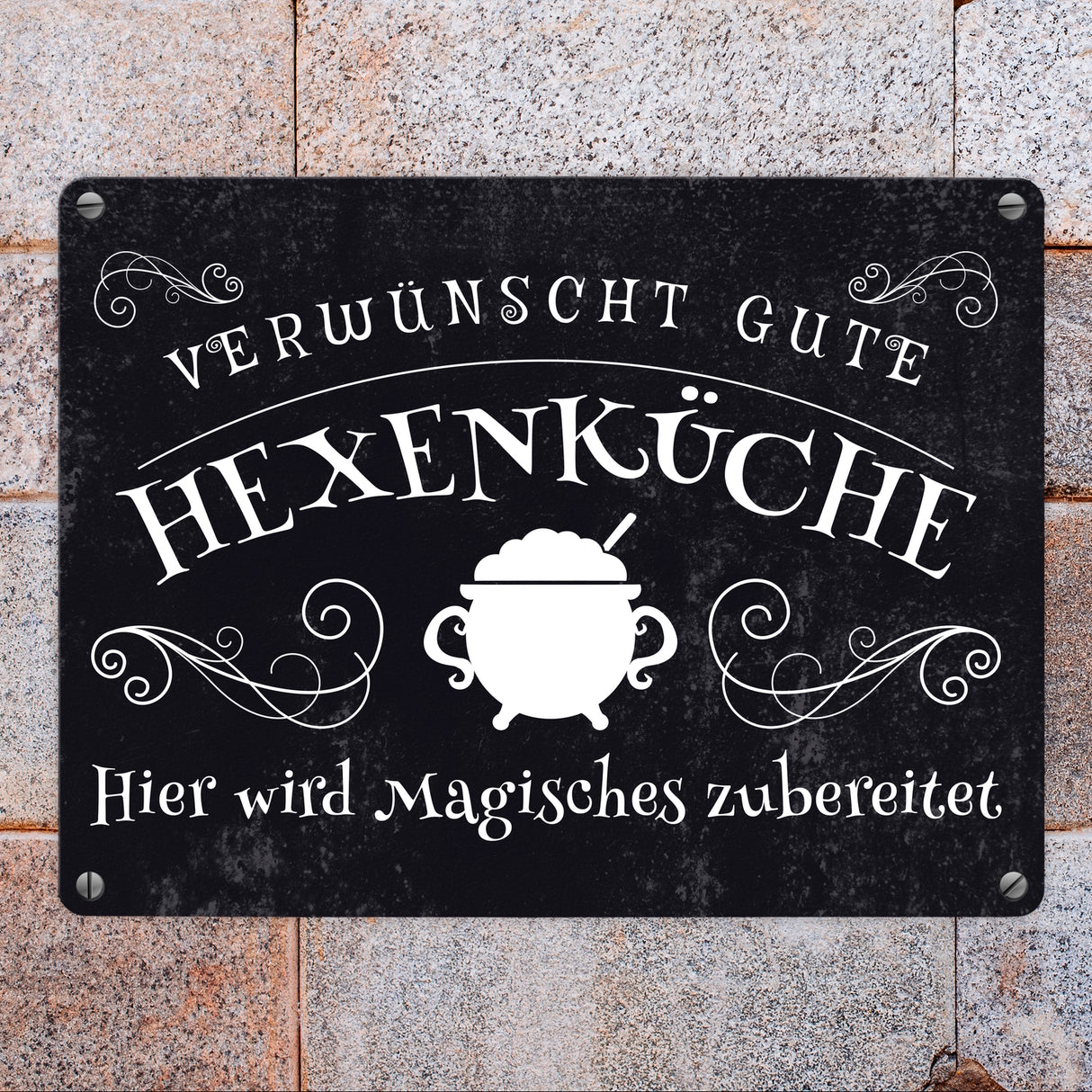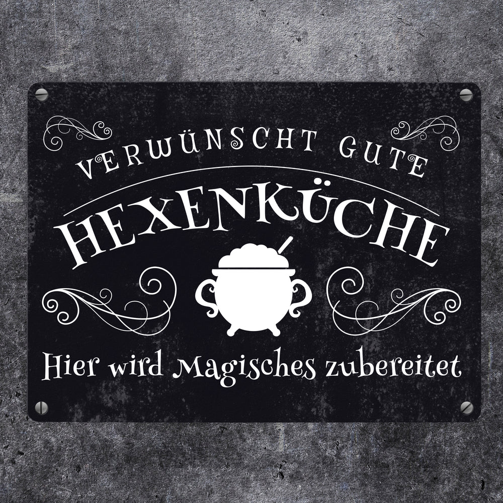 - 1x Verwünscht gute Hexenküche Halloween Metallschild mit lustigem Spruch in der gewählten Größe