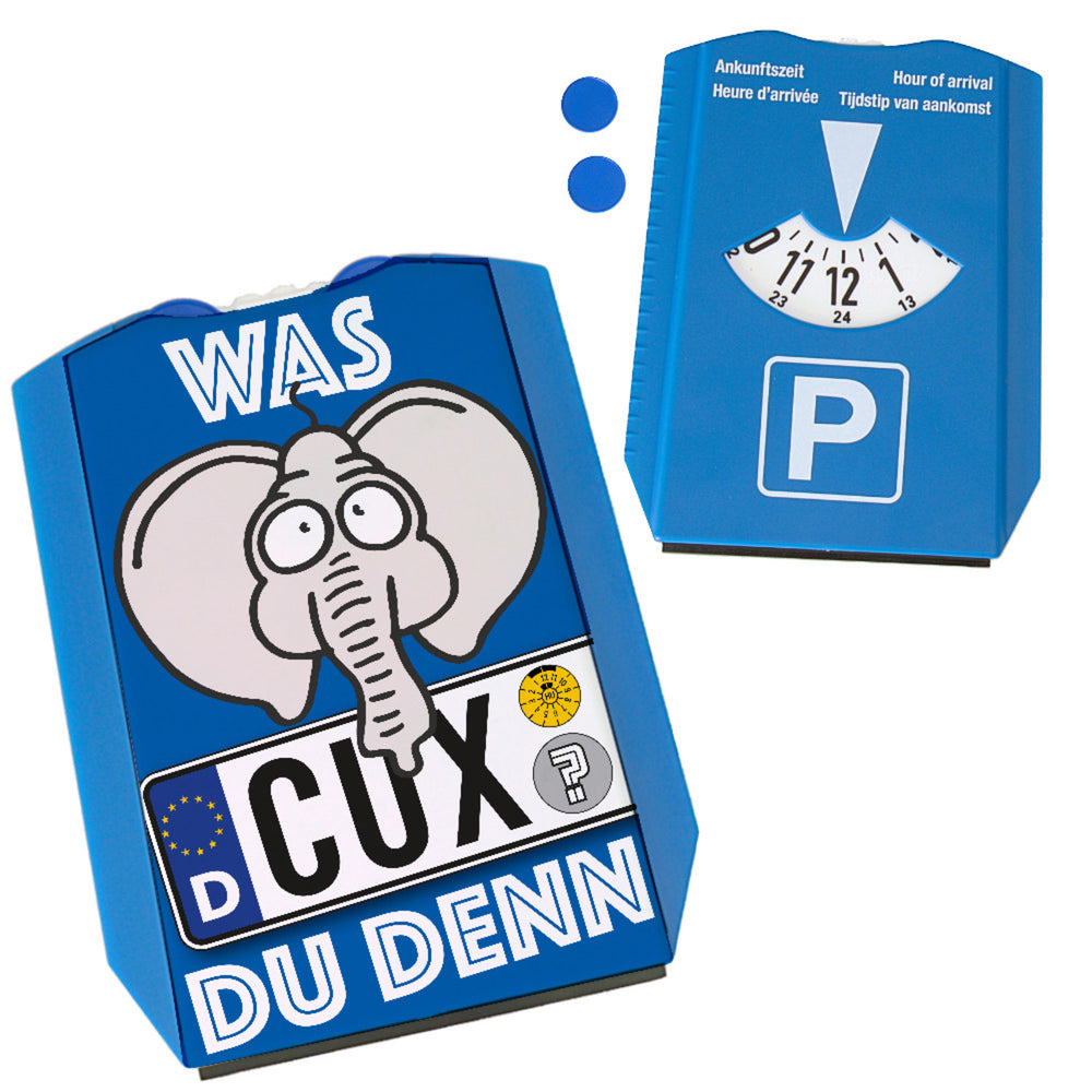 Beantworten Sie die Frage „Was CUX-DU denn?“ mit der Was CUX-DU denn Parkscheibe! Diese originelle Parkscheibe ist ein witziges Accessoire für Ihr Auto und bietet neben dem Hingucker zusätzlich eine gute Funktion. Mit dem lustigen Elefantenmotiv macht sie sicherlich auf jedem Parkplatz Eindruck. Lieferumfang ist die Was CUX-DU denn Parkscheibe samt 2 Einkaufswagenchips und der Garantie, dass sie nach § 42 StVO konform ist. Zudem kann sie als Eiskratzer, Eisbrecher und Wasserabstreifer verwendet werden. Der hochwertige und widerstandsfähige UV-Druck verspricht lange Freude an Ihrem neuen Accessoire. Also ran an die Was CUX-DU denn Parkscheibe!