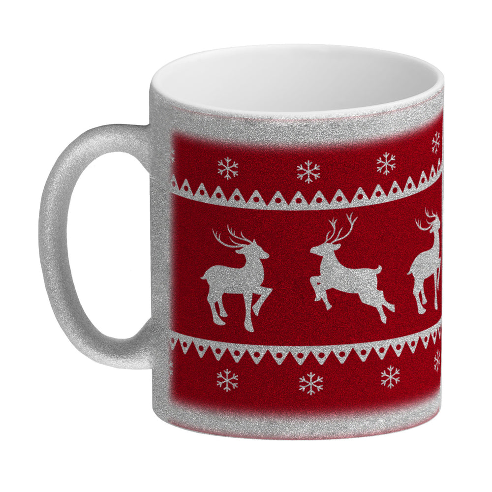Bringe dieses Weihnachtsfest mit dem wunderschönen Kaffeebecher mit den dekorativen Rentieren ein Stückchen näher. Egal ob du dir selbst eine Freude machen möchtest oder ein kleines Geschenk zum Wichteln und Schrottwichteln suchst, hier bist du genau richtig. Der Kaffeebecher ist in verschiedenen Varianten erhältlich: Als weiße Standardtasse, mit farbigem Henkel und Innenseite, als edle Glastasse oder in der exklusiven Silberedition mit Glitzereffekt. Mit Sorgfalt in Handarbeit hergestellt in Deutschland liefert er immer einen optimalen Genuss bei Kaffee, Tee oder Glühwein. Genieße die kalte Weihnachtszeit ganz bequem aus dieser tollen Tasse und bringe so gesellige Momente zu dir nach Hause! Vergiss dabei nicht, dass der Kaffeebecher auch spülmaschinenfest ist. Frohe Weihnachten und viel Spaß mit dem Weihnachts-Kaffeebecher!