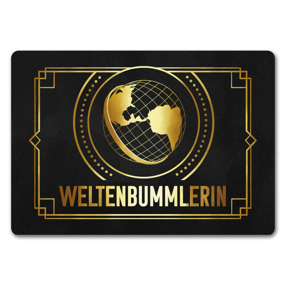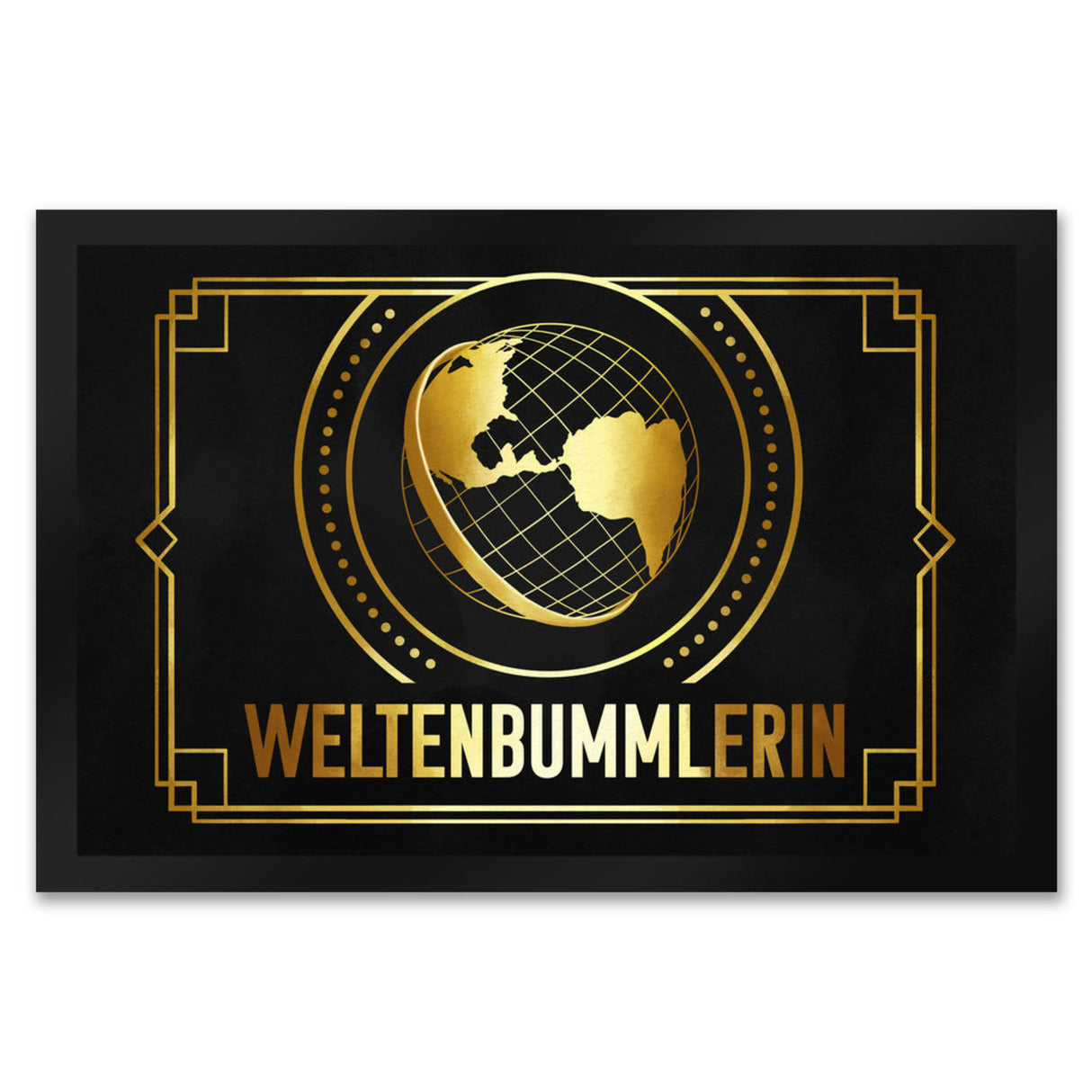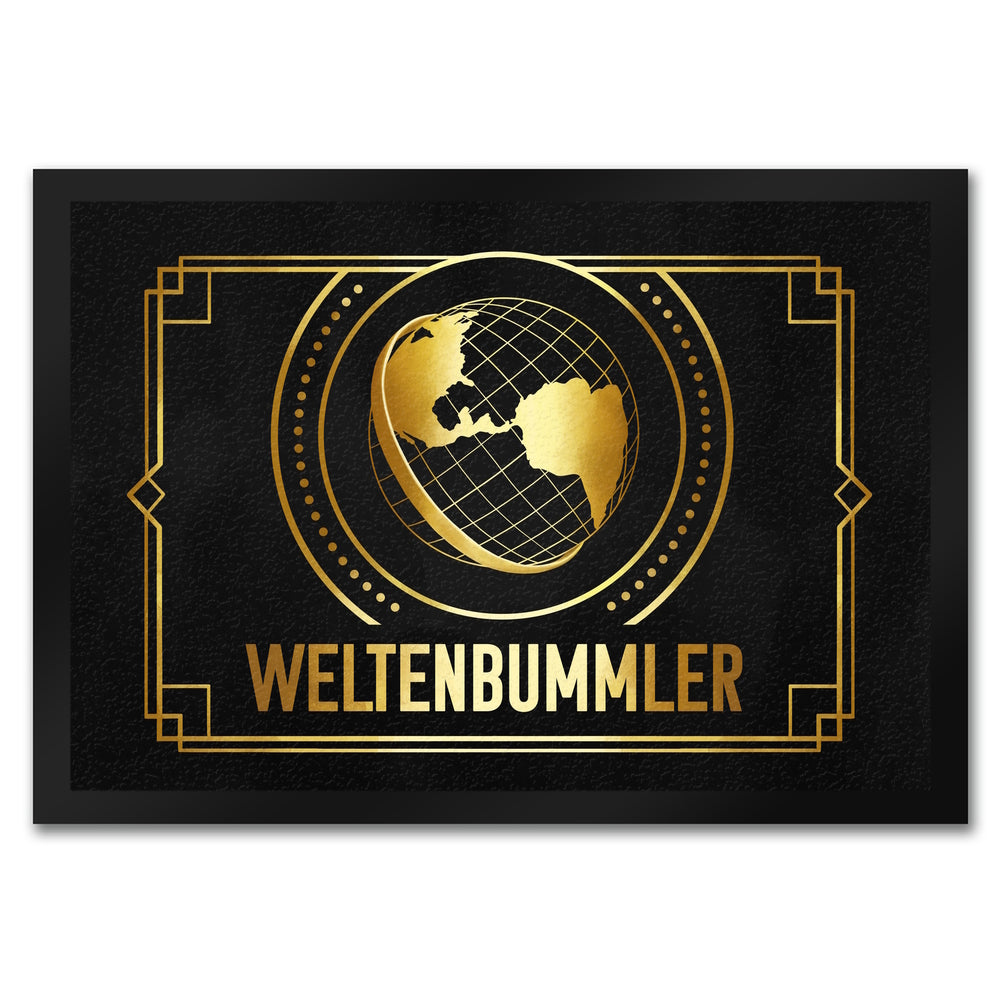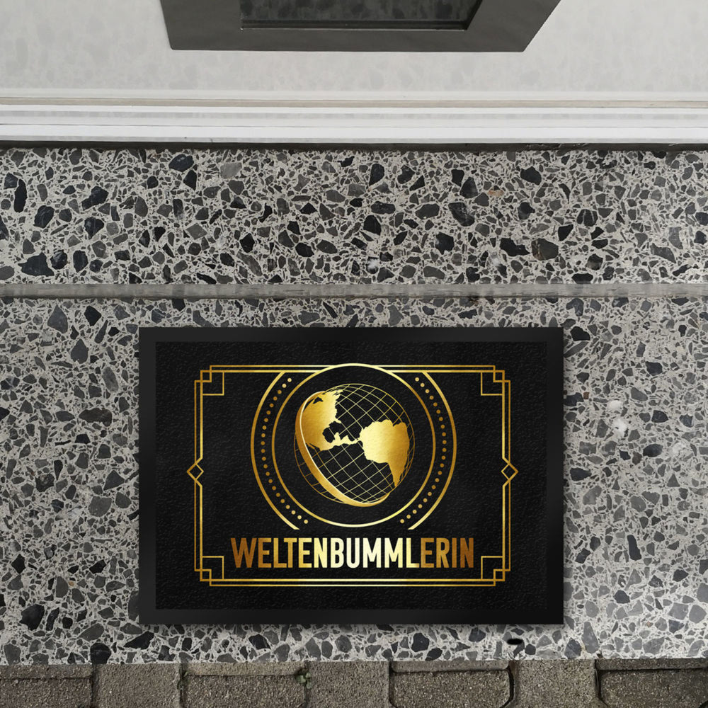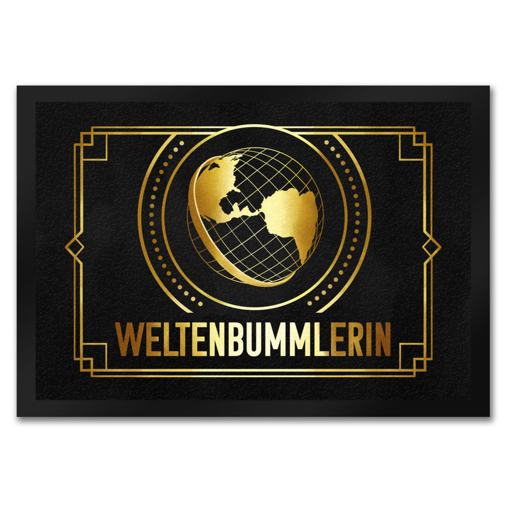 Weltenbummler Fußmatte mit goldenem Globus und Reisemotiv - 50x35 cm / Weltenbummler ist auf Lager und wird versandt, sobald es wieder verfügbar ist
