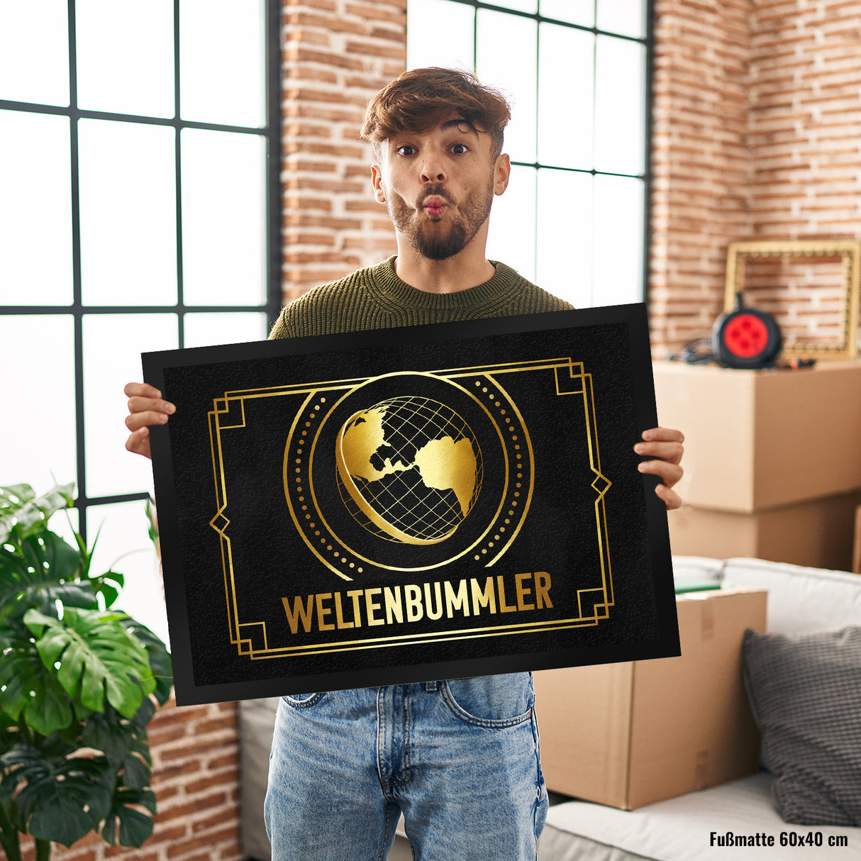 Weltenbummler Fußmatte mit goldenem Globus und Reisemotiv