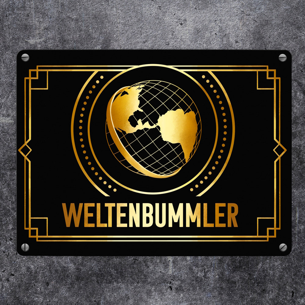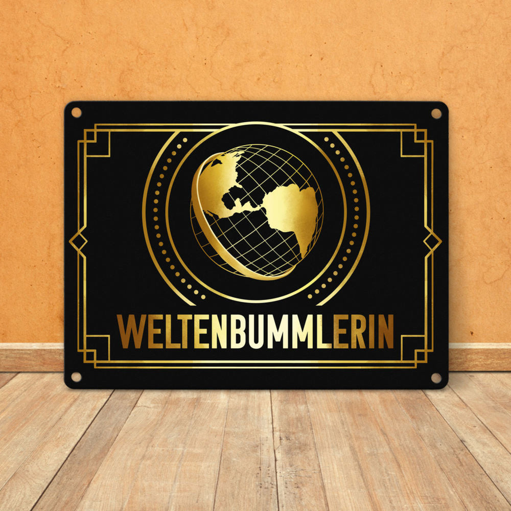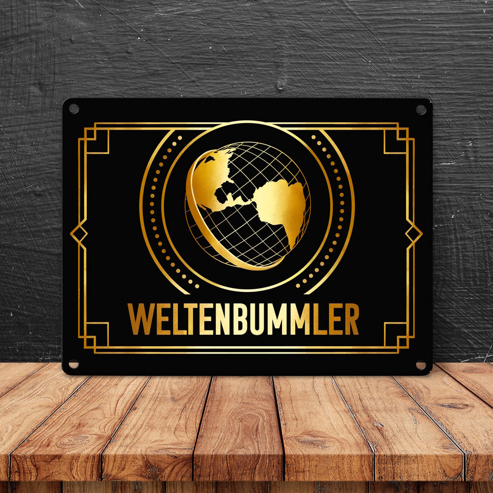 Weltenbummler Metallschild mit goldenem Globus und Reisemotiv - 15x20 cm / Weltenbummler ist auf Lager und wird versandt, sobald es wieder verfügbar ist