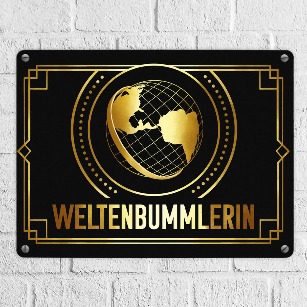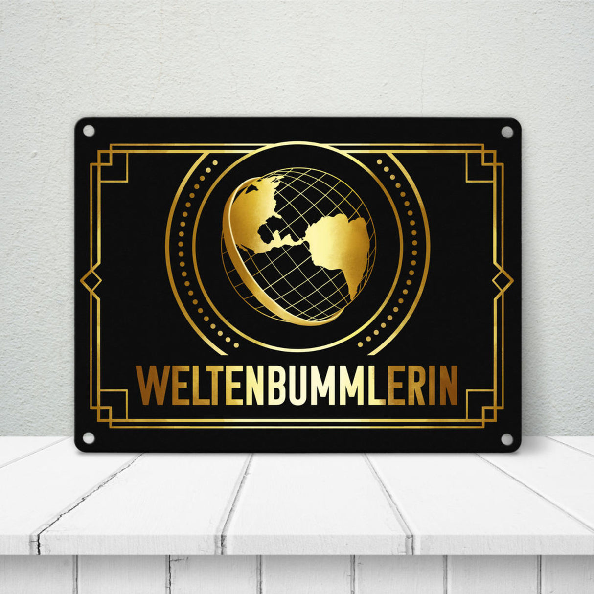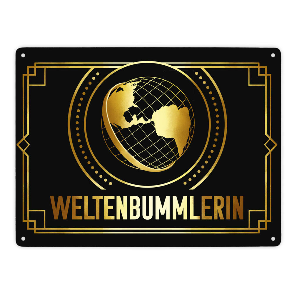 Weltenbummler Metallschild mit goldenem Globus und Reisemotiv - 15x20 cm / Weltenbummler ist auf Lager und wird versandt, sobald es wieder verfügbar ist
