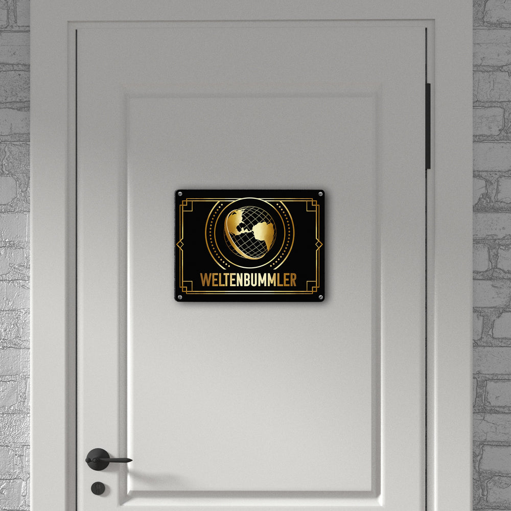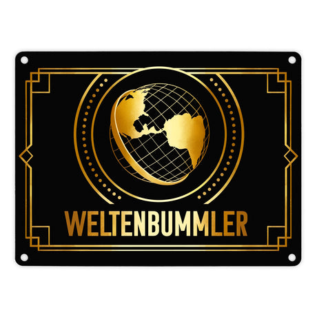 Weltenbummler Metallschild mit goldenem Globus und Reisemotiv