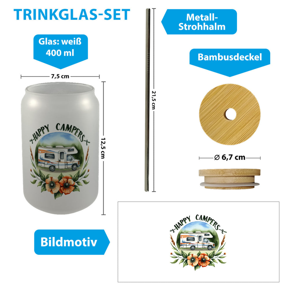 • 1x Wohnmobil Happy Campers Trinkglas mit Bambusdeckel mit Bambusdeckel oder Henkel