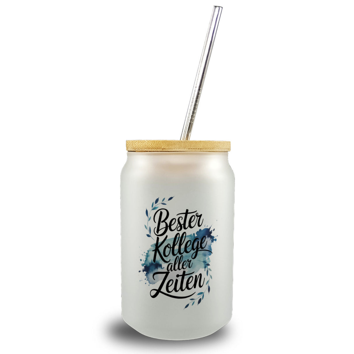 - 1x Bester Kollege aller Zeiten Trinkglas mit Bambusdeckel Aquarelles Blattmuster mit Bambusdeckel oder Henkel