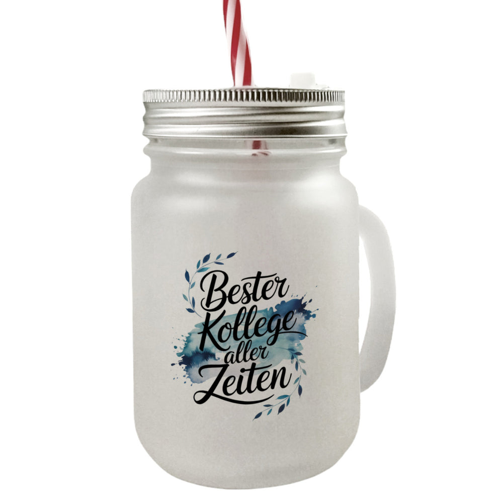 - Dieses Trinkglas ist ein wahres Kunstwerk, das mit einem aquarellartigen Design auf einem weißen Hintergrund verziert ist. Der Satz "Bester Kollege aller Zeiten" prangt in großen, eleganten Buchstaben. Der Glasrand wird von kunstvollen Blattmustern umrahmt, während ein dynamischer, blau-türkiser Aquarellspritzer das Design komplettiert.