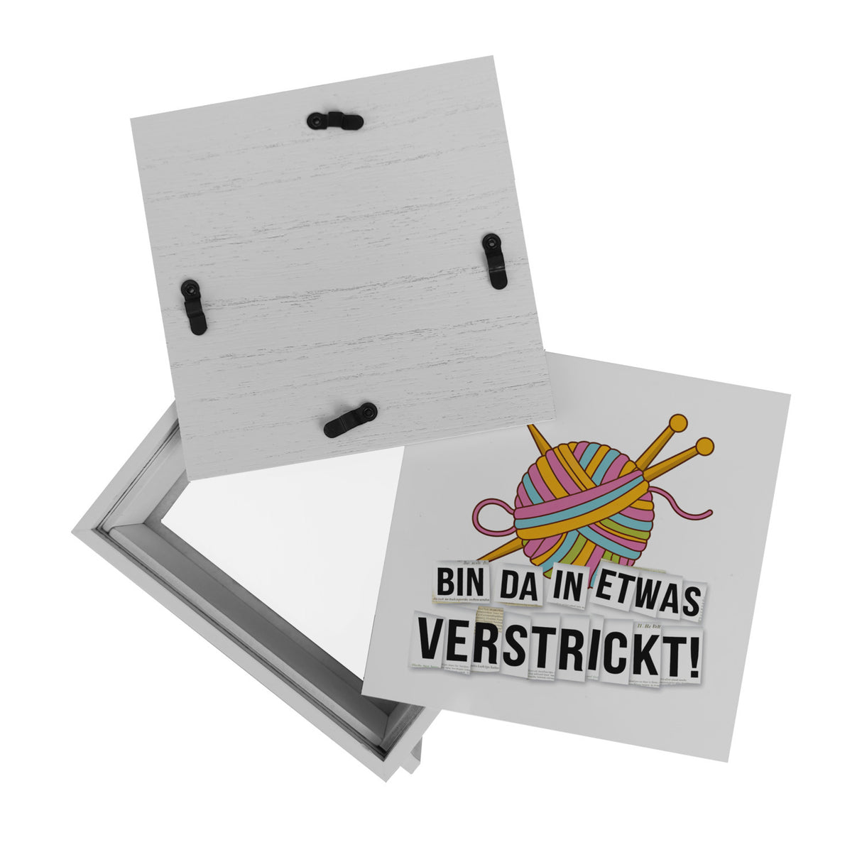 • Die Spardose "Bin da in etwas verstrickt!" besticht durch ihr farbenfrohes Design mit einem liebevoll gestalteten Wollknäuel und gekreuzten Stricknadeln. Der witzige Text aus Zeitungsbuchstaben gleicht einem skurrilen Drohbrief und verleiht der femininen Spardose einzigartigen Charme. Der weiße Hintergrund hebt das Motiv besonders hervor.