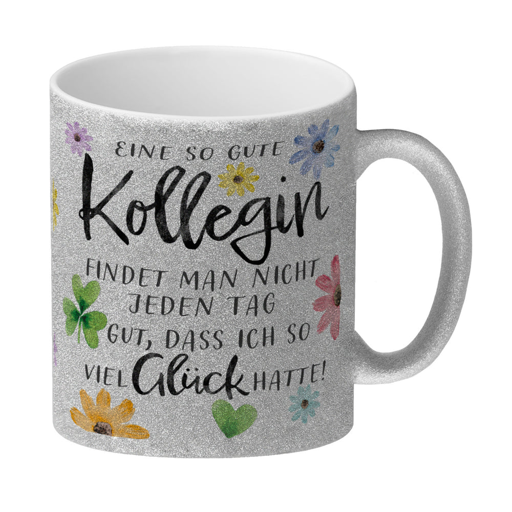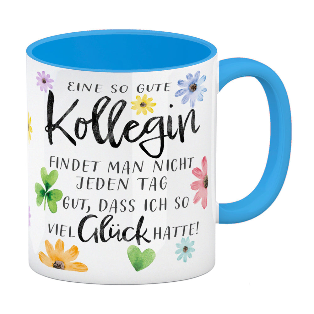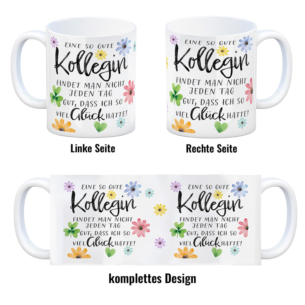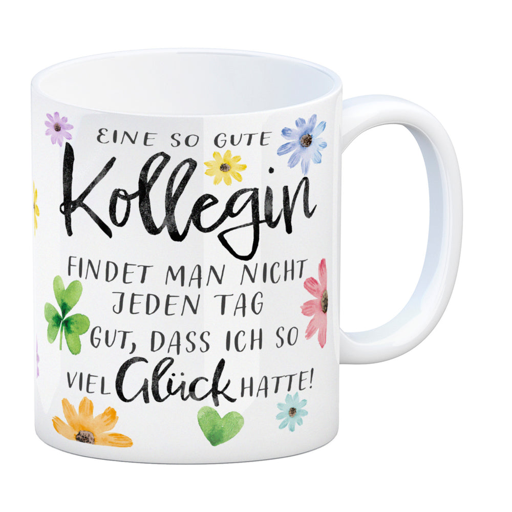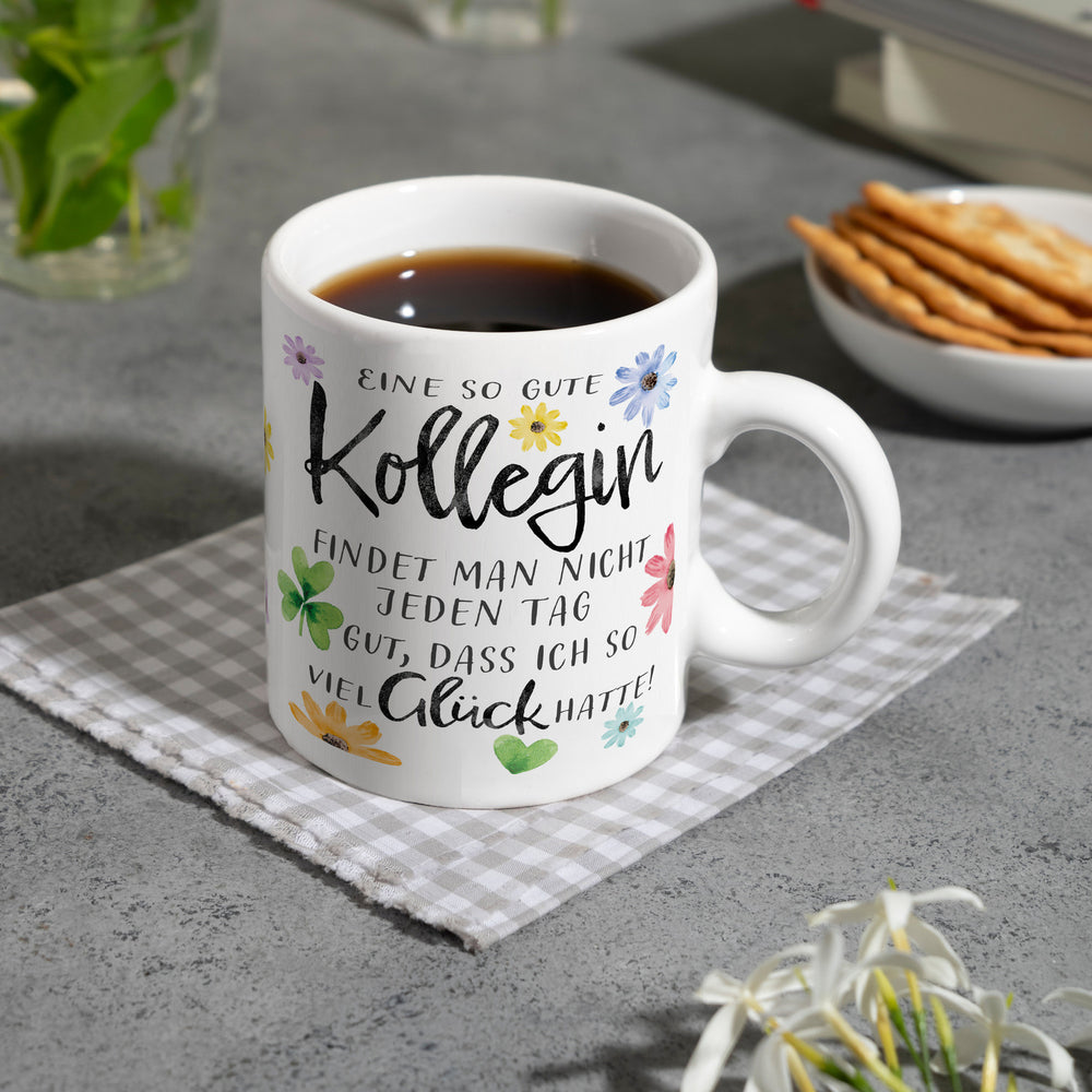 - Ein Hoch auf die Lieblingskollegin, die Morgende erträglich macht! Mit Blumen und einem charmanten Spruch drapiert, ist dieser Kaffeebecher der Muntermacher für jede Schreibtischtäterin. "Eine so gute Kollegin findet man nicht jeden Tag. Gut, dass ich so viel Glück hatte!" – plaudert das Porzellan.