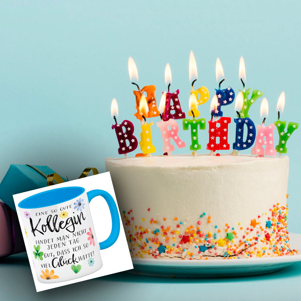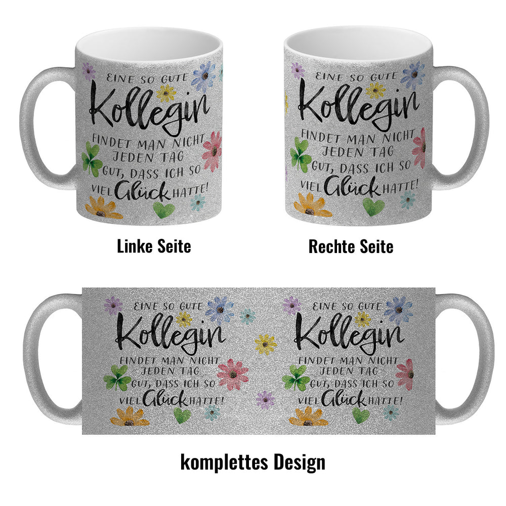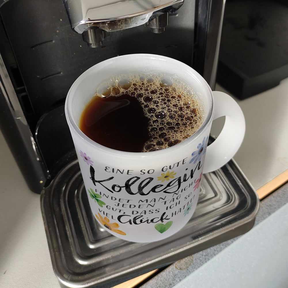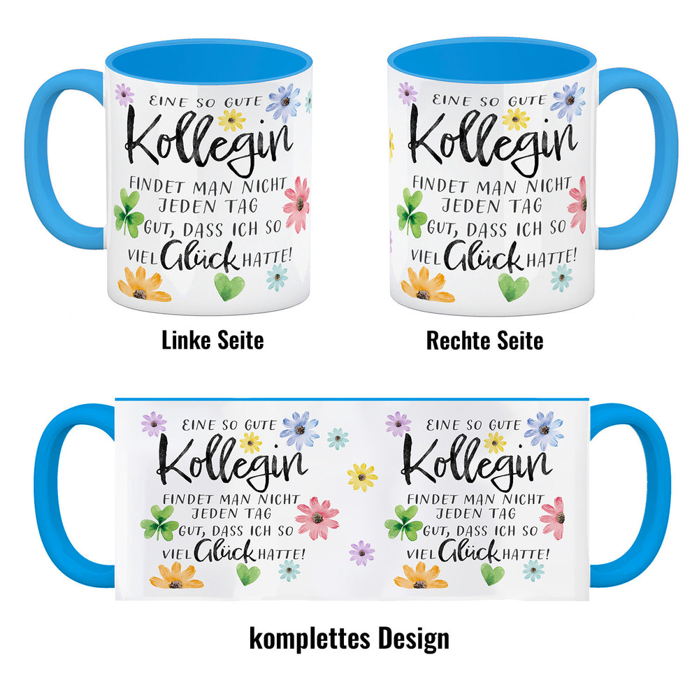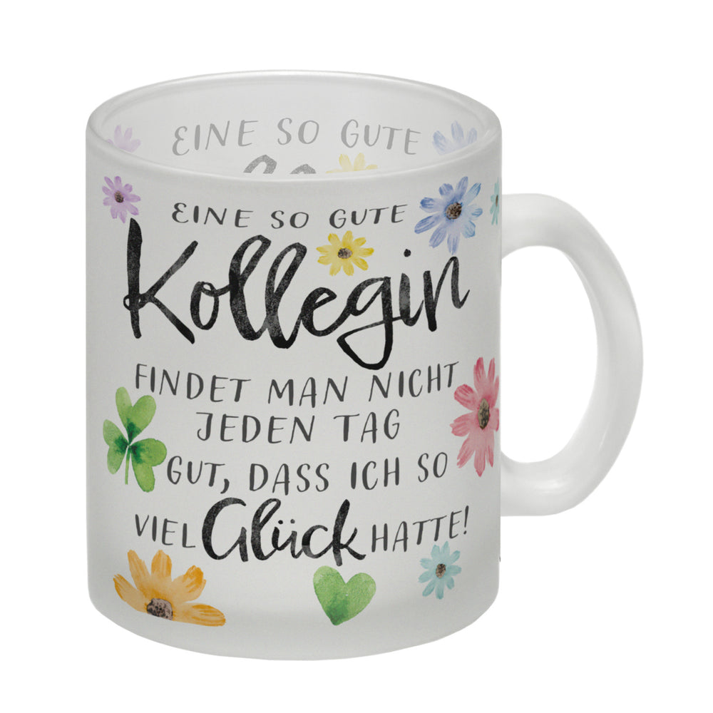 - Ein Hoch auf die Lieblingskollegin, die Morgende erträglich macht! Mit Blumen und einem charmanten Spruch drapiert, ist dieser Kaffeebecher der Muntermacher für jede Schreibtischtäterin. "Eine so gute Kollegin findet man nicht jeden Tag. Gut, dass ich so viel Glück hatte!" – plaudert das Porzellan.