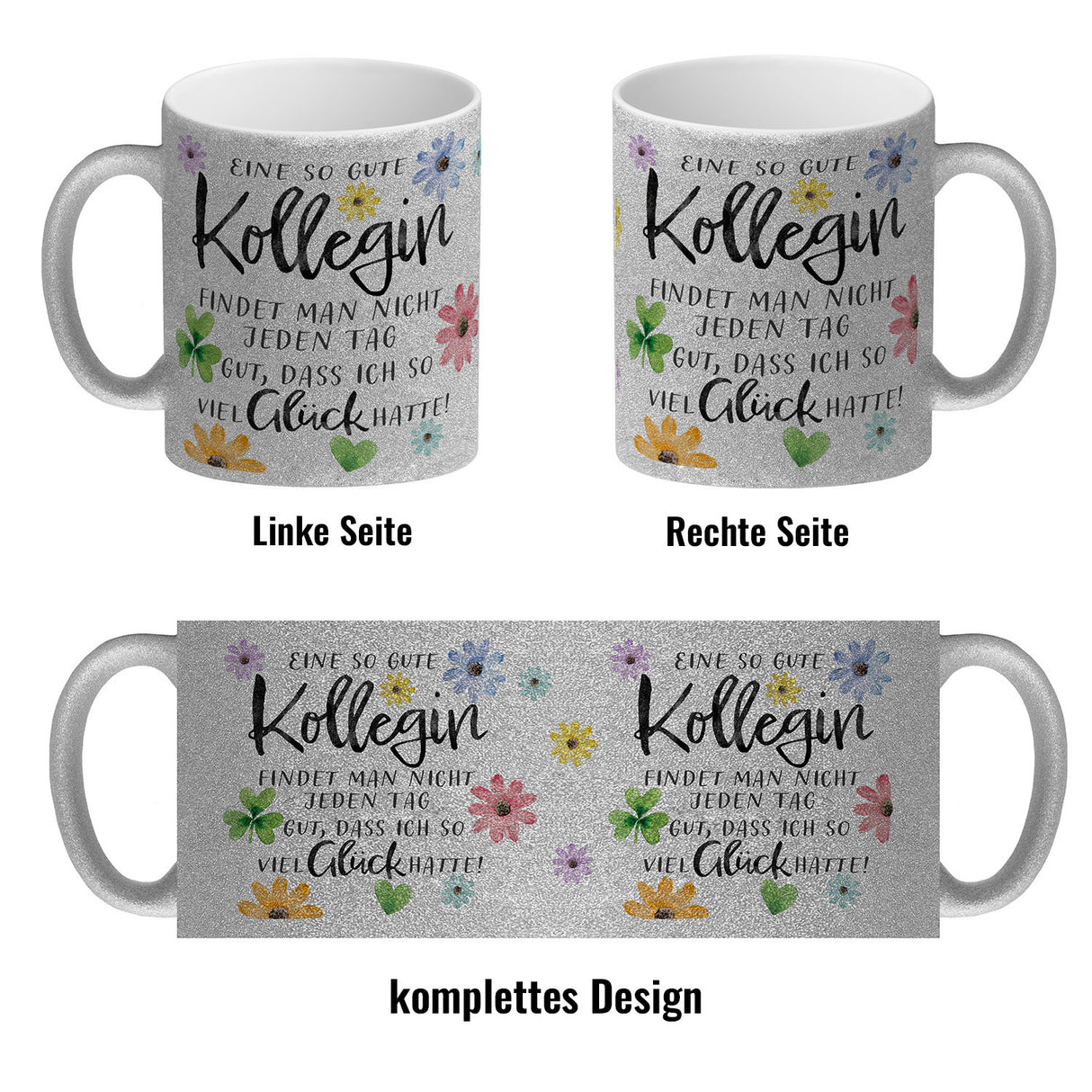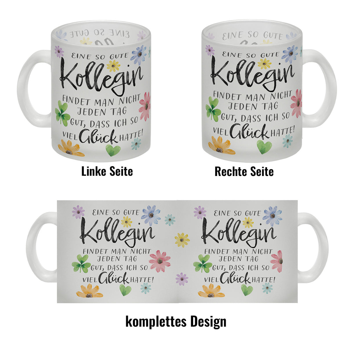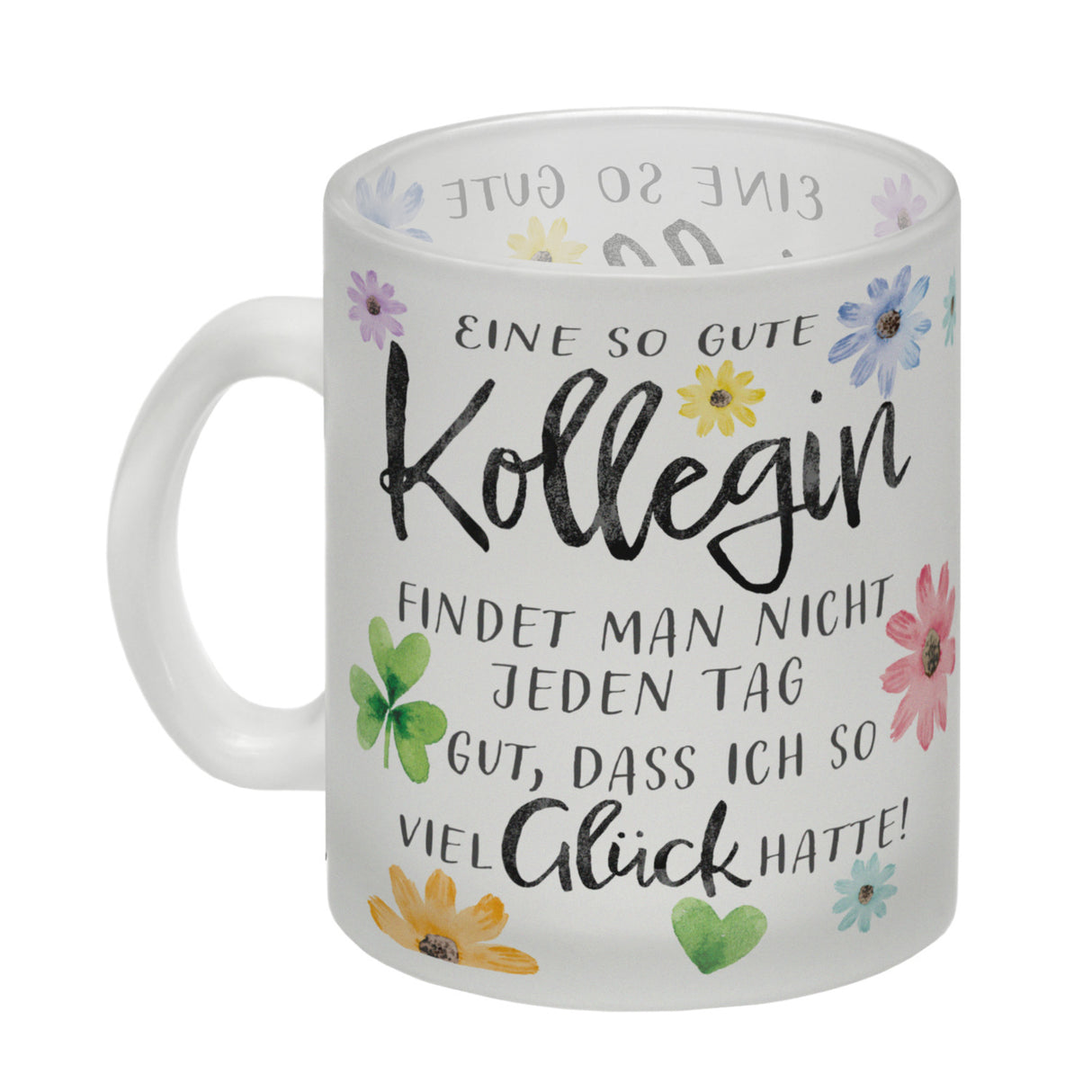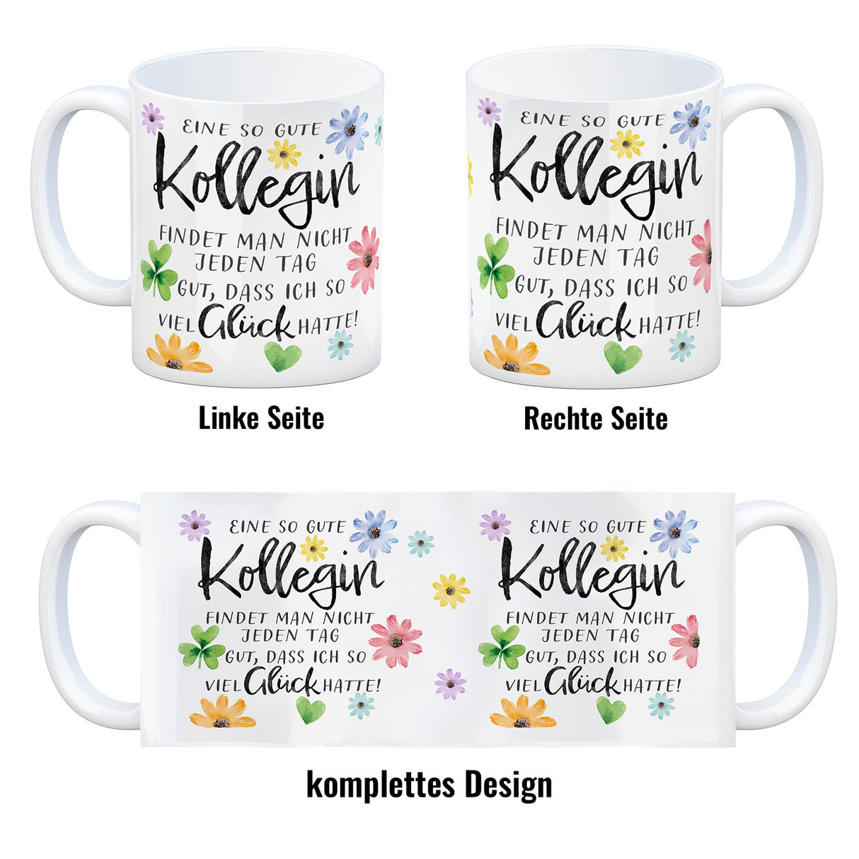 - 1x Blumen Kaffeebecher mit Spruch Glück gehabt mit toller Kollegin in der gewählten Ausführung