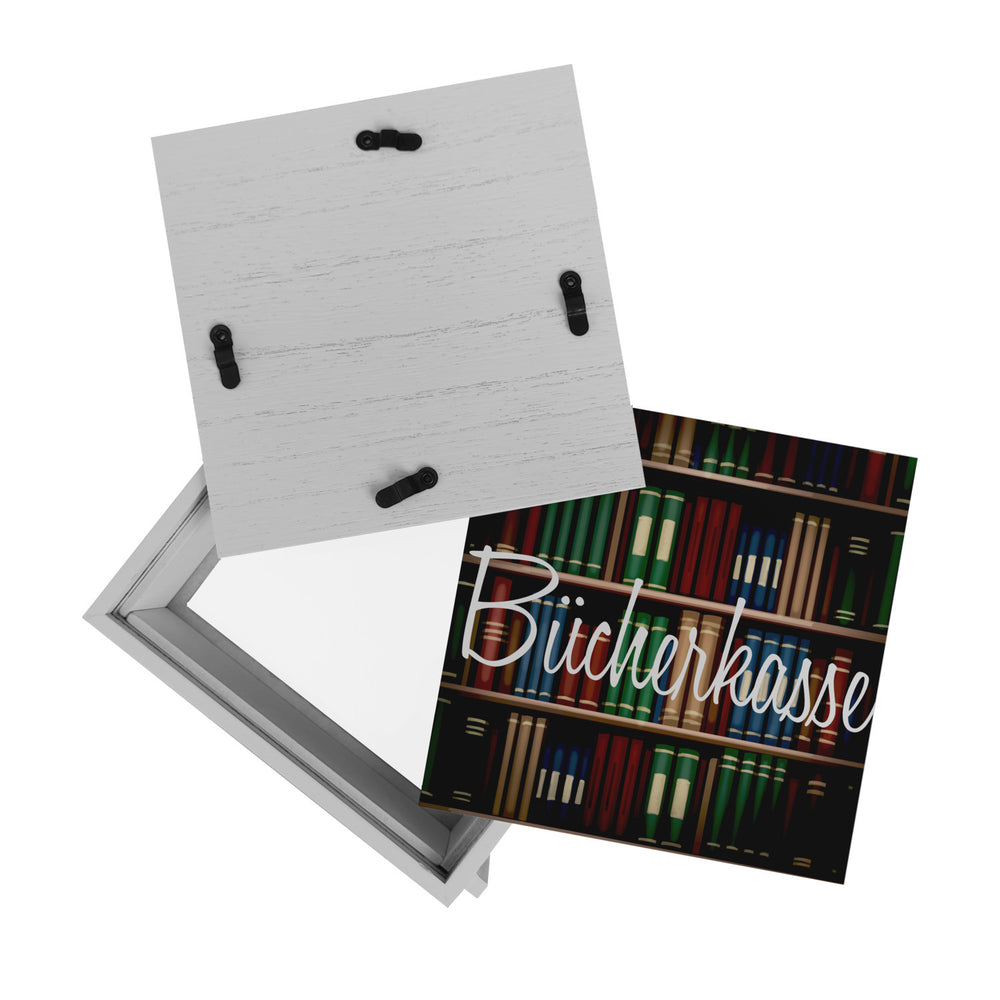 - Auf der Spardose ist ein Bücherregal abgebildet, in dem eine Menge alter Bücher stehen. Davor steht in weißer Schrift Bücherkasse geschrieben. Das Motiv erinnert an die Regale einer alten Bibliothek, was der Geldbüchse einen antiken Look verleiht.